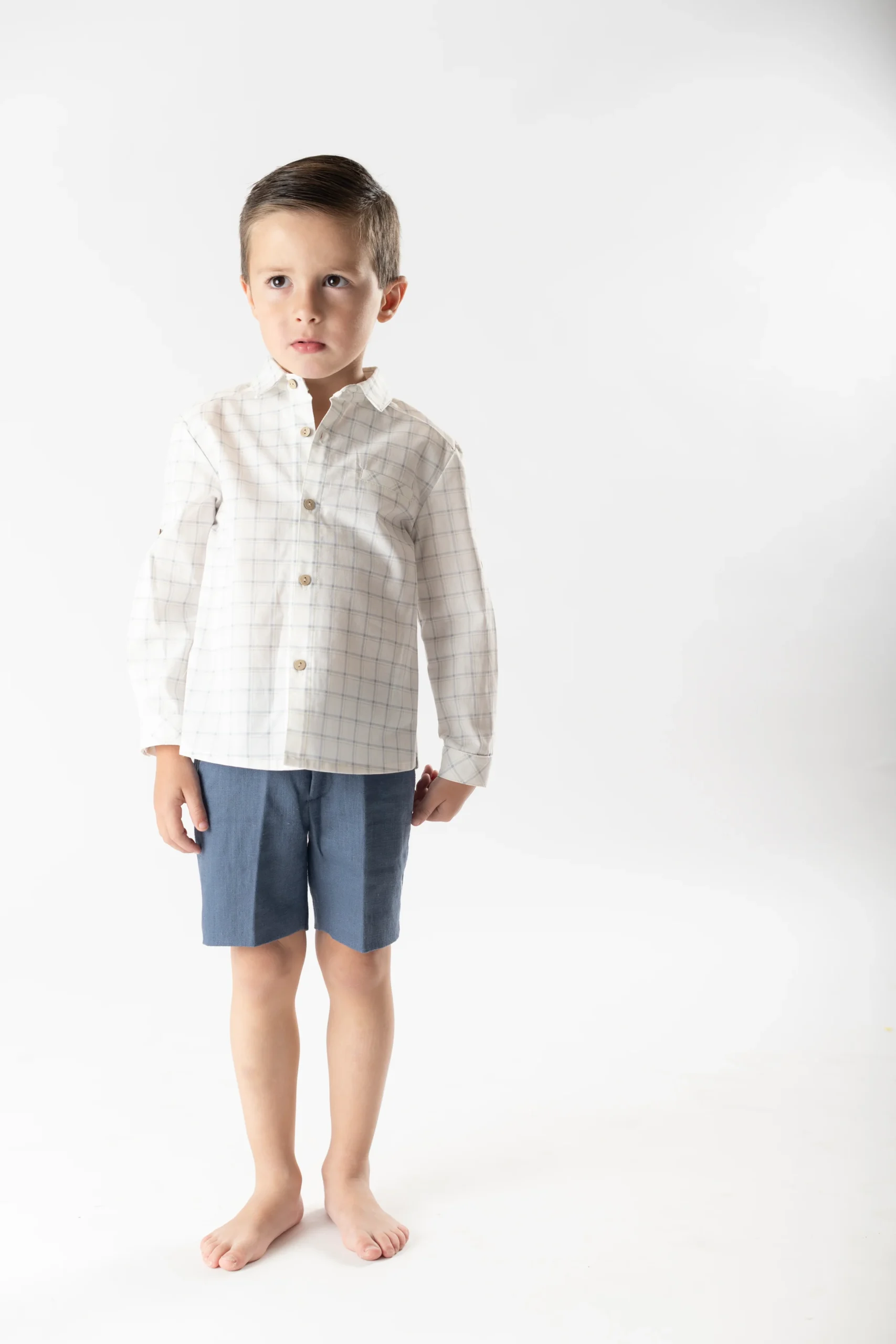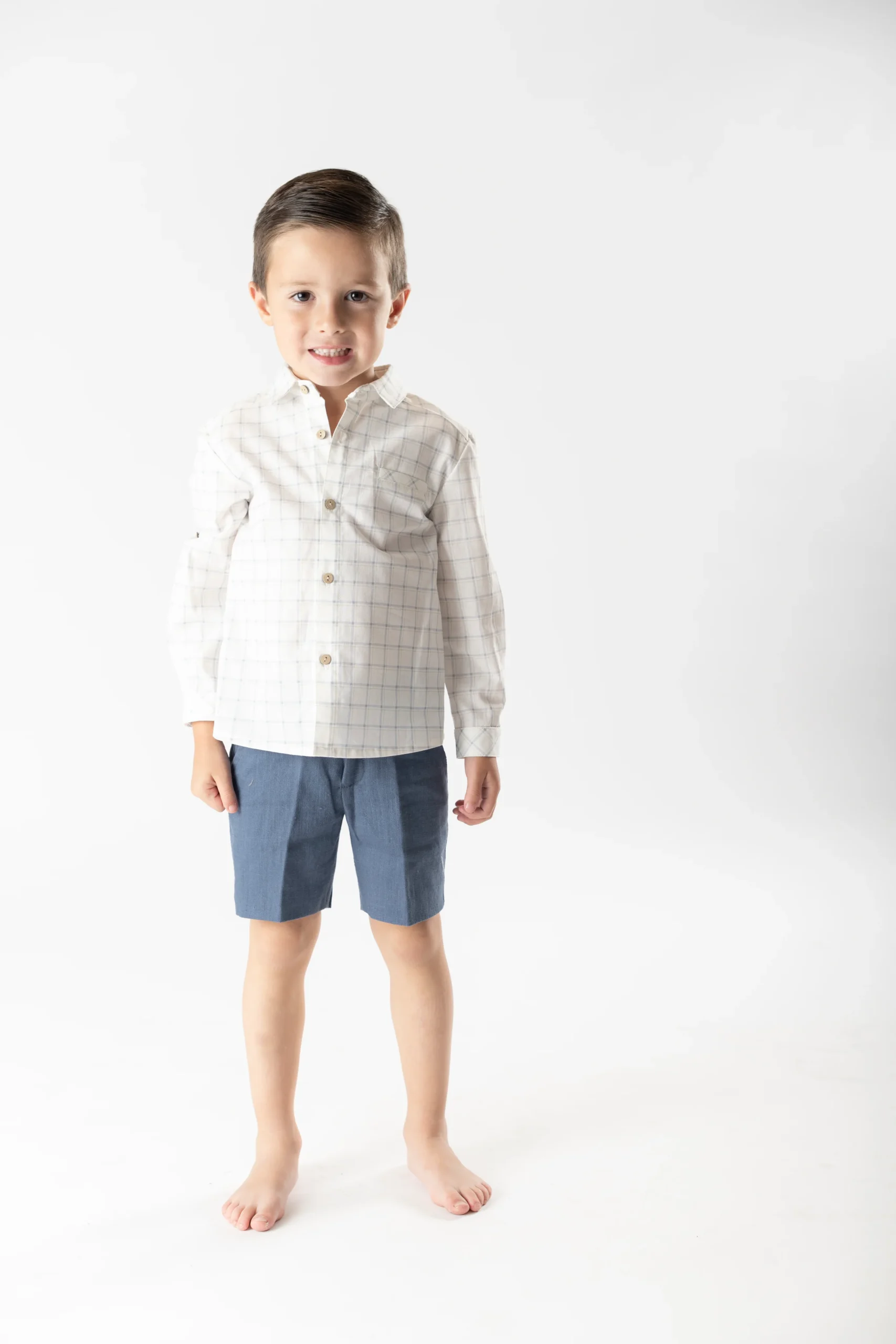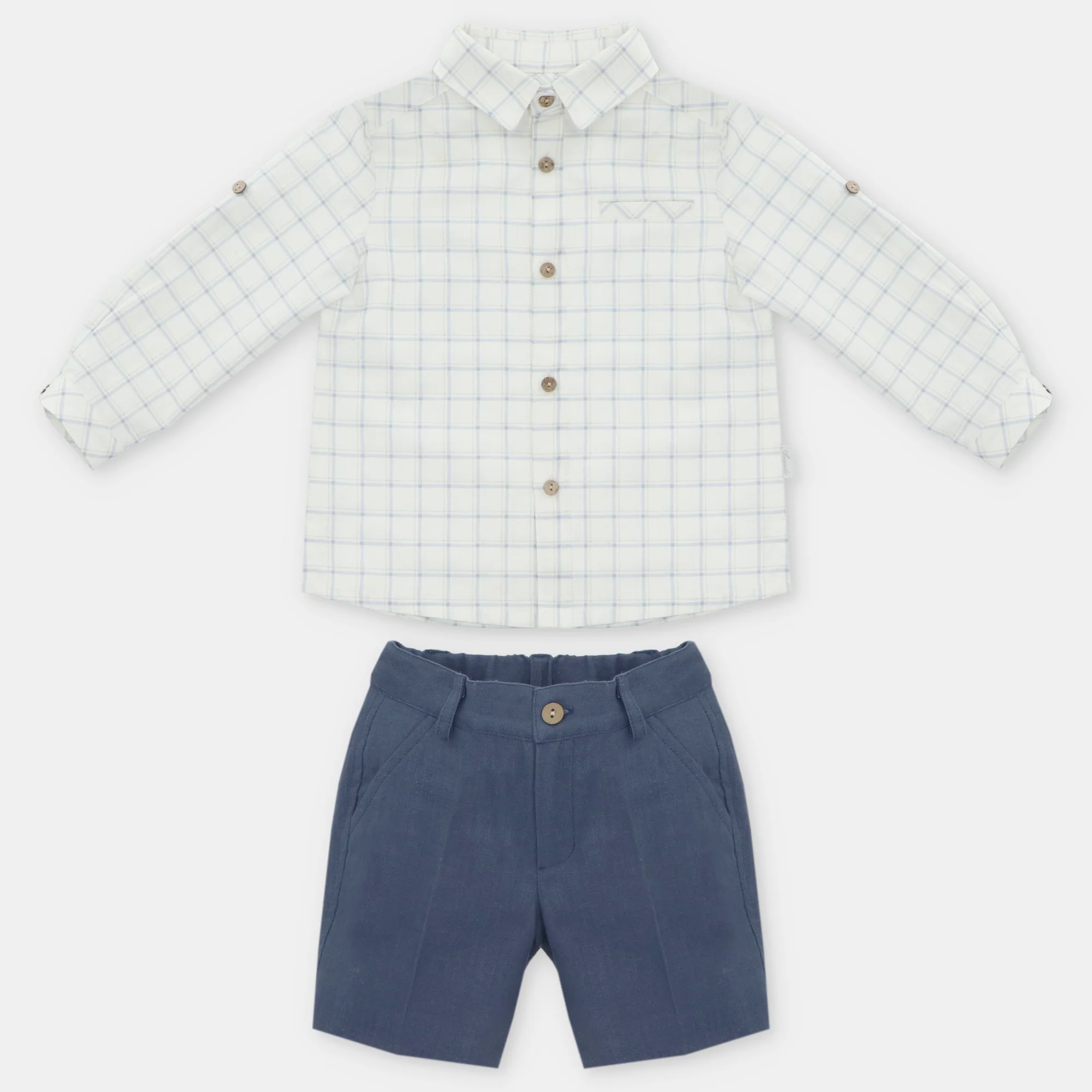 ¡Fresco y elegante conjunto de camisa y bermudas a juego! Camisa de cuello camisero, manga larga ajustable con trabilla, estampado de cuadros y cierre de botones por el frente. Bermudas de color liso, cierre de boton y ziper con elastico ajustable en cintura.
