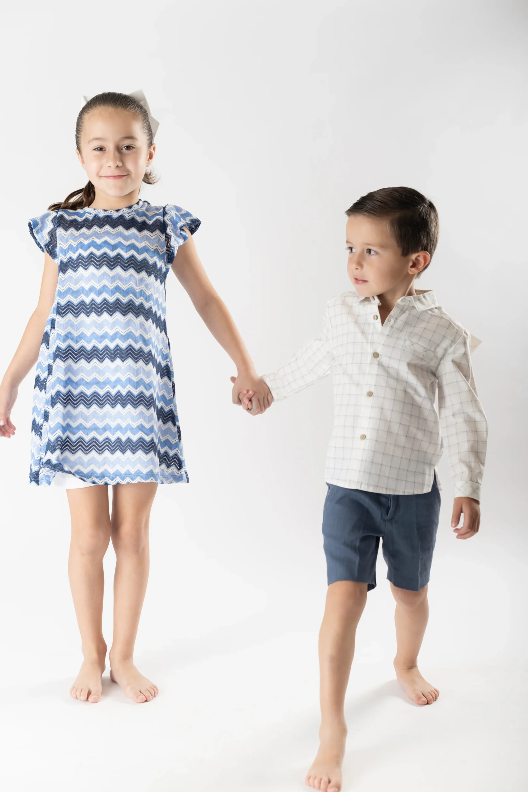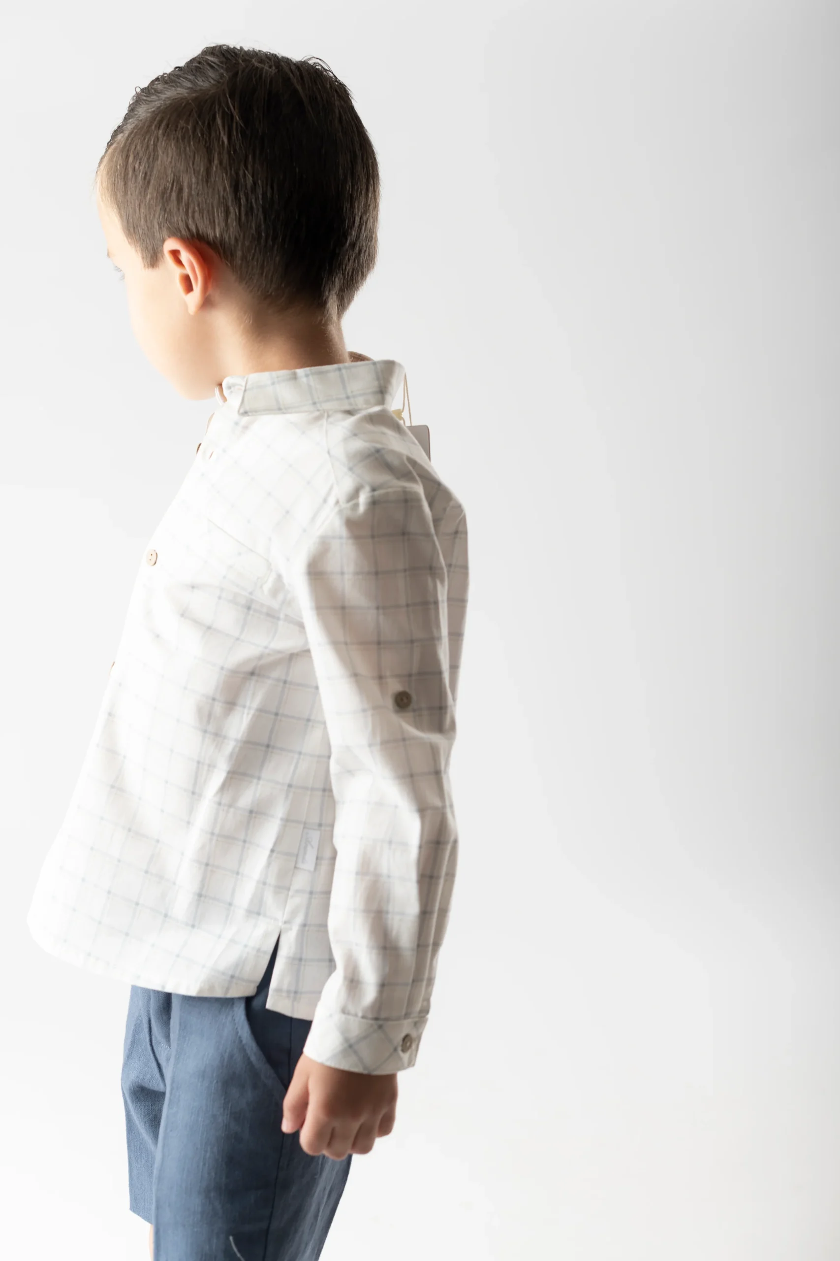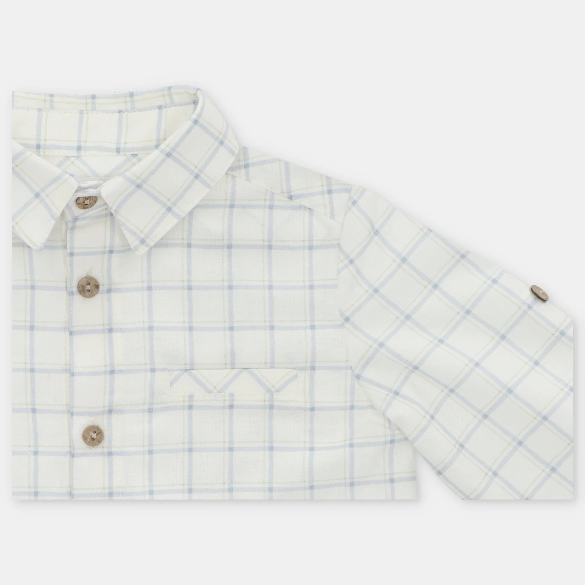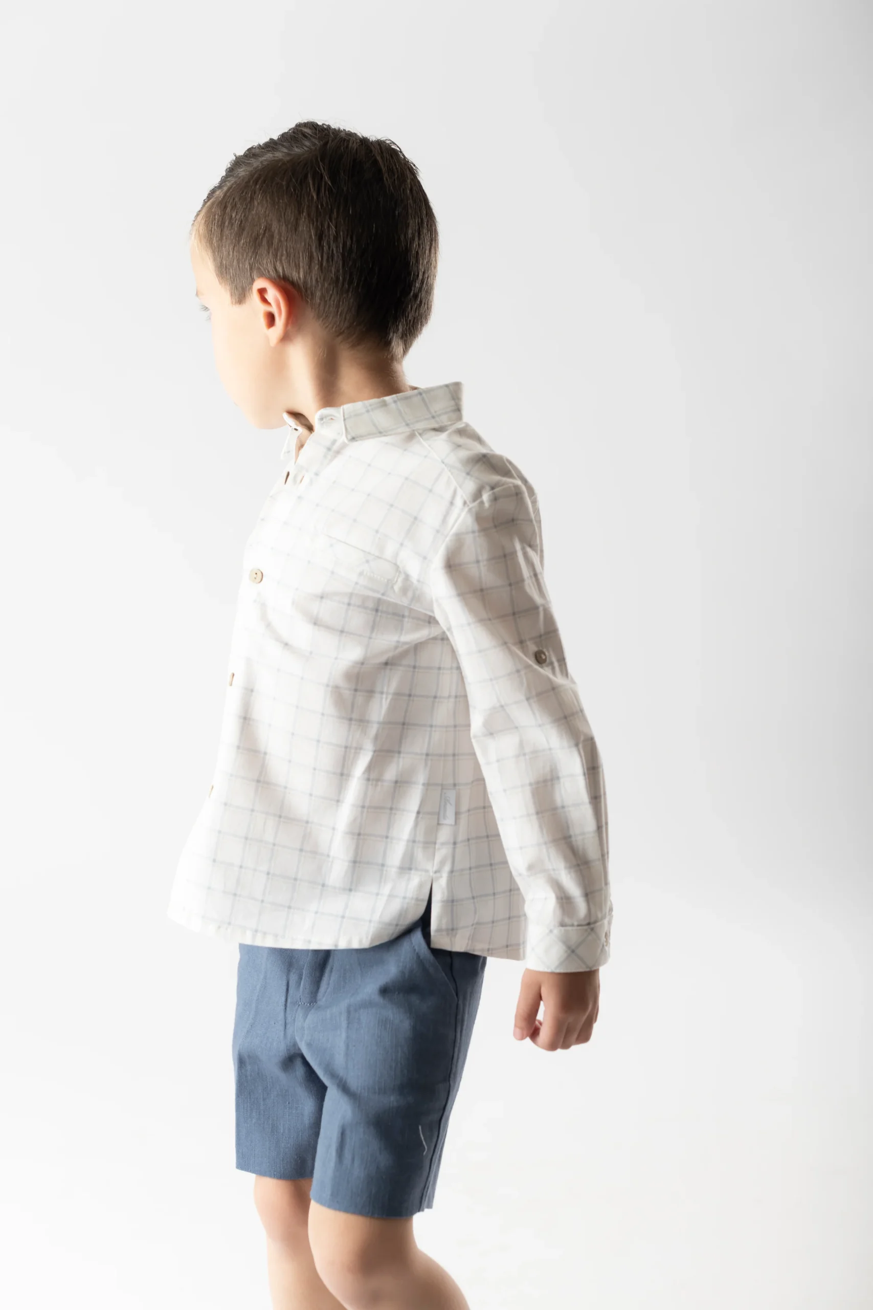 ¡Fresco y elegante conjunto de camisa y bermudas a juego! Camisa de cuello camisero, manga larga ajustable con trabilla, estampado de cuadros y cierre de botones por el frente. Bermudas de color liso, cierre de boton y ziper con elastico ajustable en cintura.