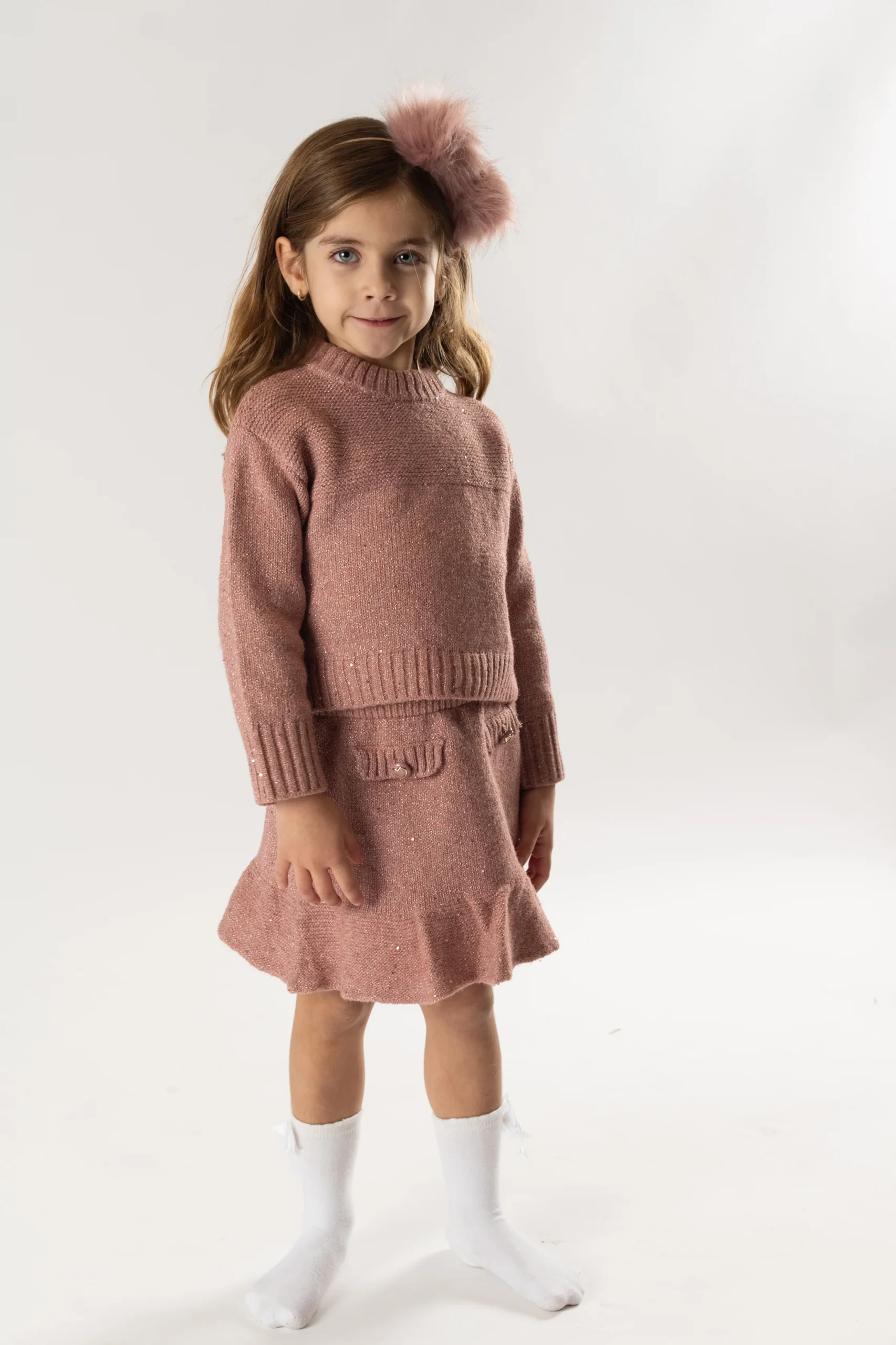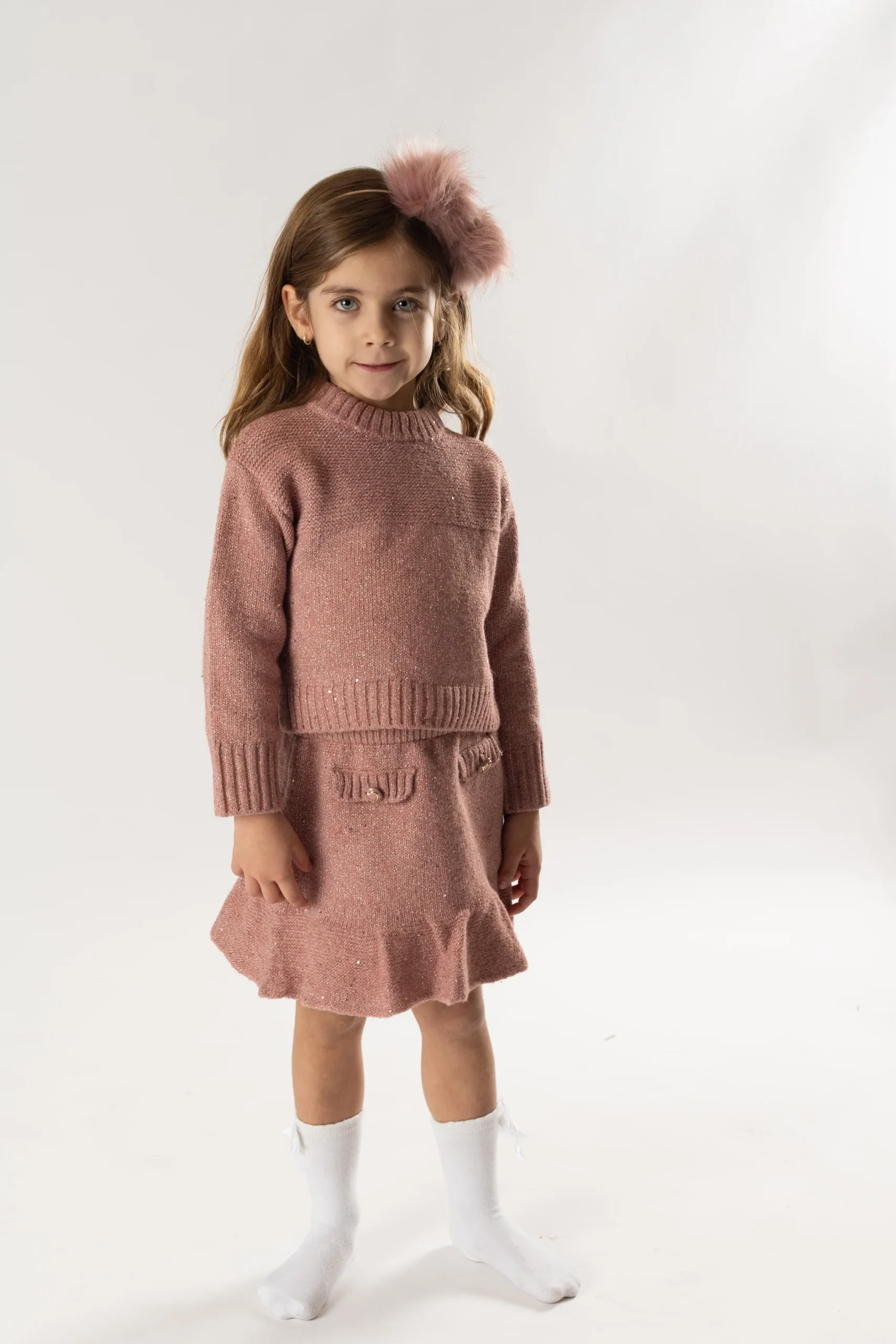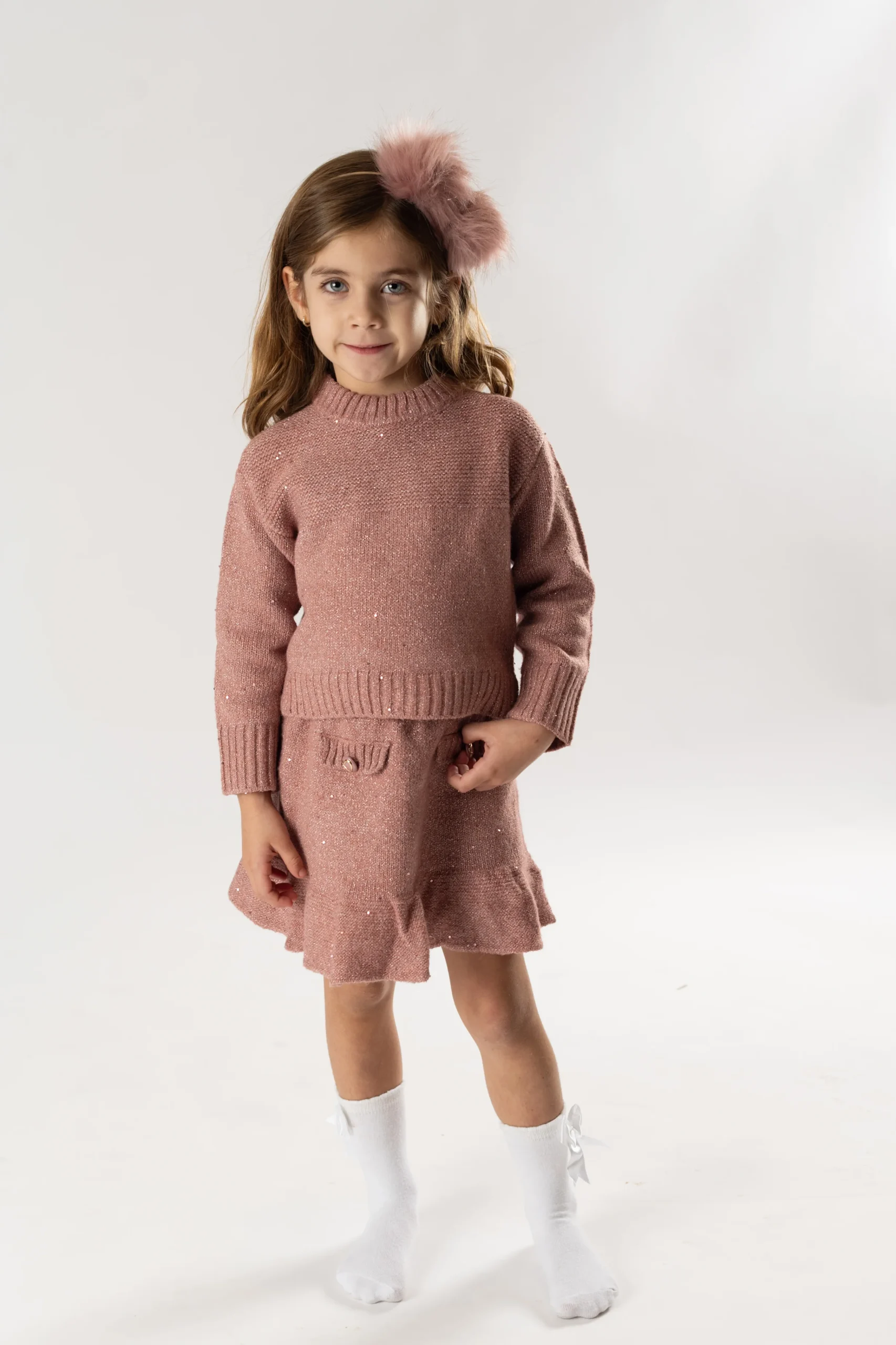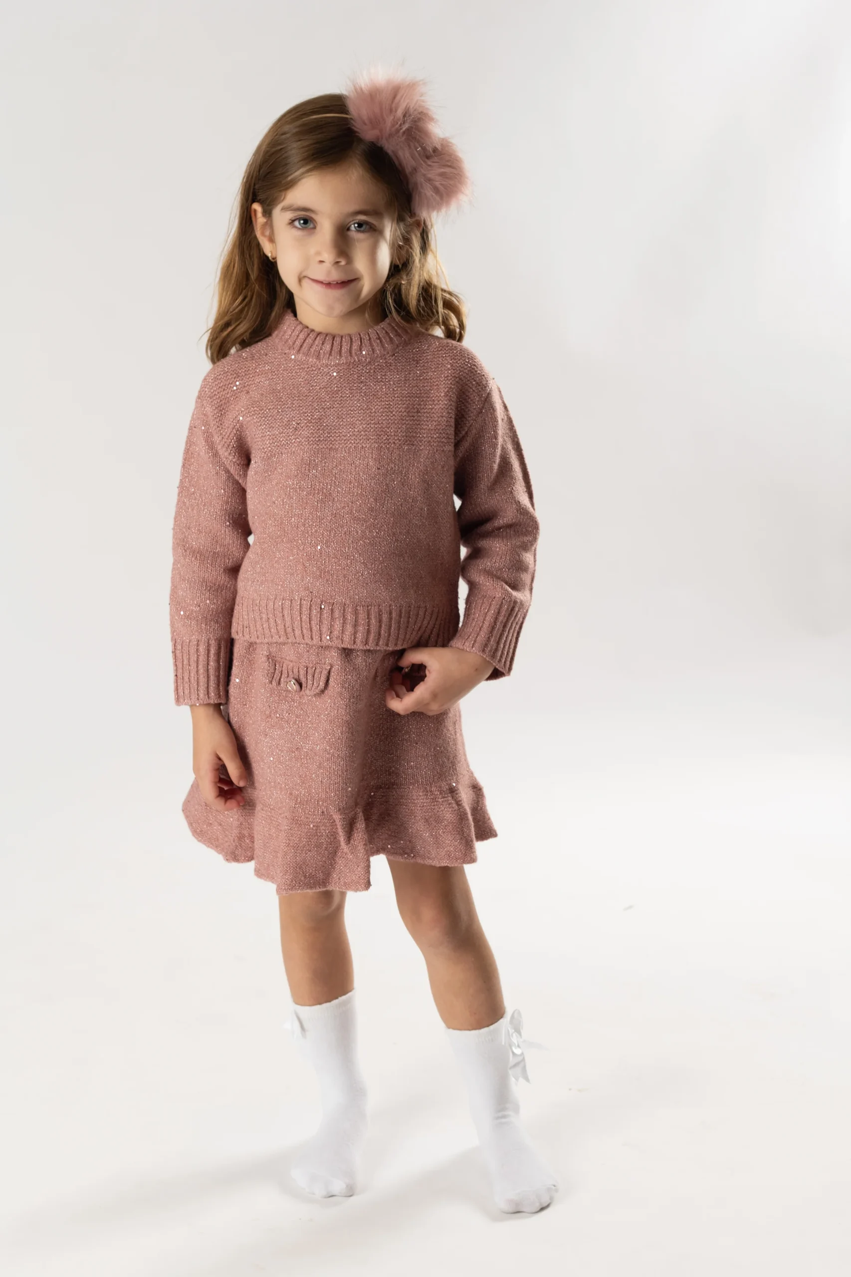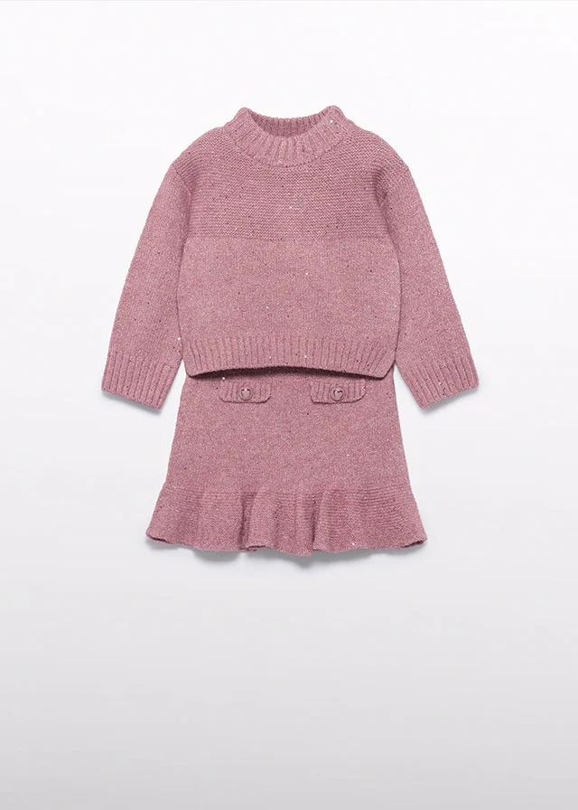 ¡Divino y vestidor conjunto de sueter y falda a juego! Sueter de manga larga, cuello redondo, detalle de tejido de punto con relieve, falda a juego con elastico en la cintura, detalle de bolsillos frontales simulados con botones bordados, diseño con volantes en el bajo de la prenda.