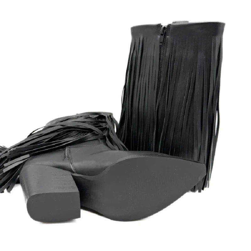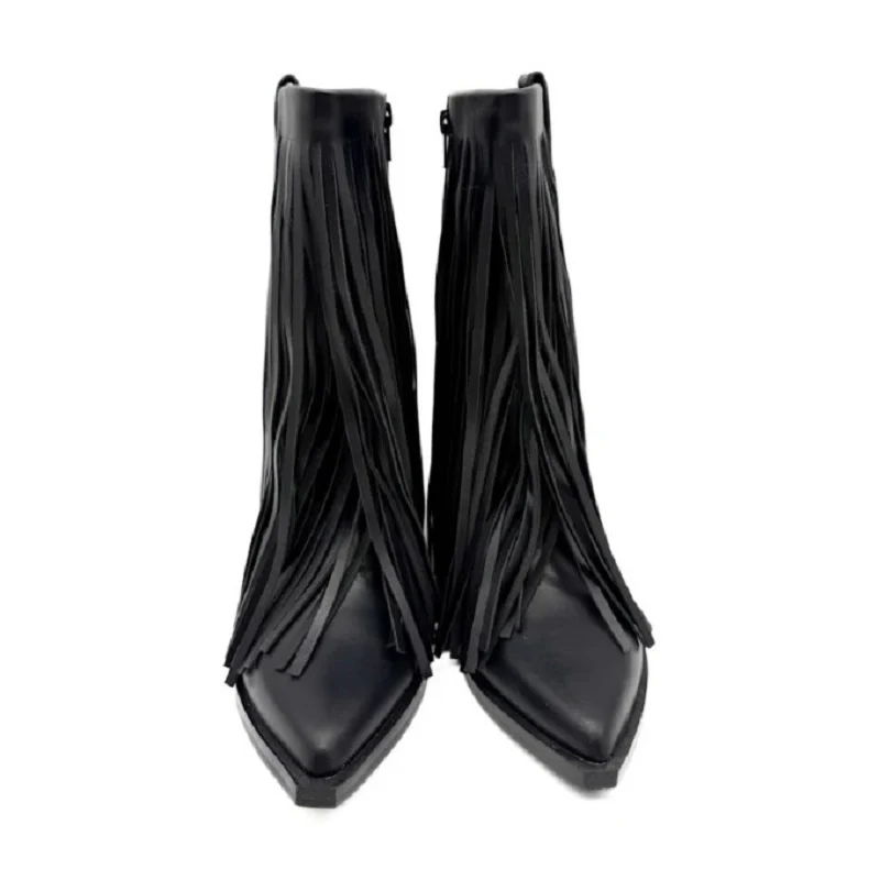 Botín cowboy negro destaca por su largo fleco de cuero que recorre la caña, generando un movimiento hipnotizante con cada paso. La punta afilada y el tacón robusto de 6 cm proporcionan una silueta estilizada y segura. Con cierre de cremallera interior para mayor comodidad, este botín es perfecto para quien busca un look audaz y diferenciador. Confeccionado con materiales de calidad empeine sintético, forro y plantilla de tela, piso de goma garantiza durabilidad y confort. Ideal para expresar tu personalidad con estilo.