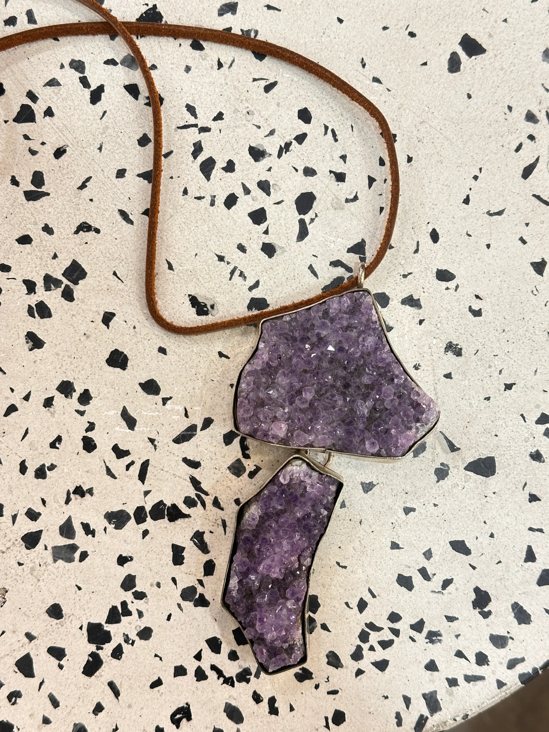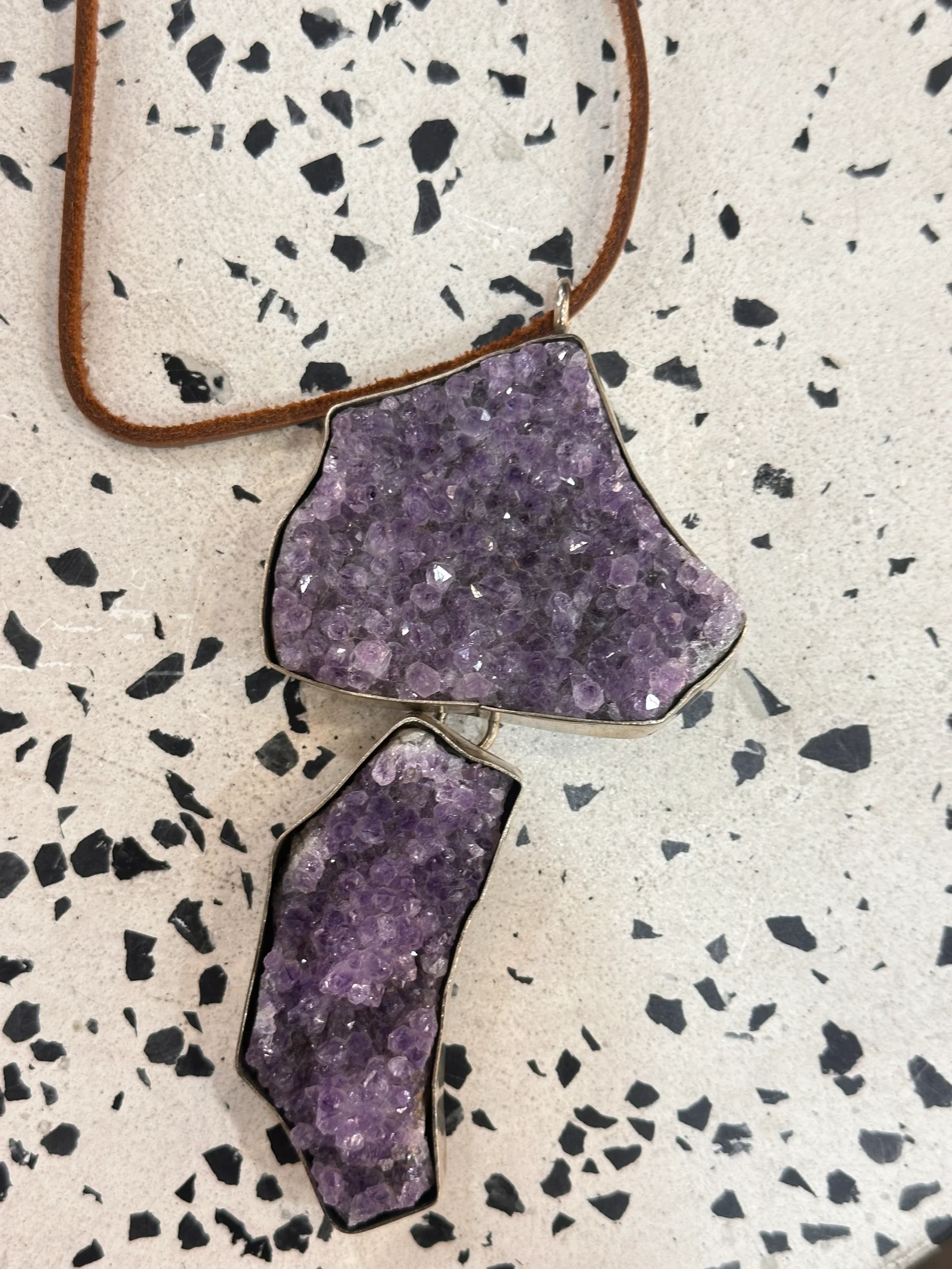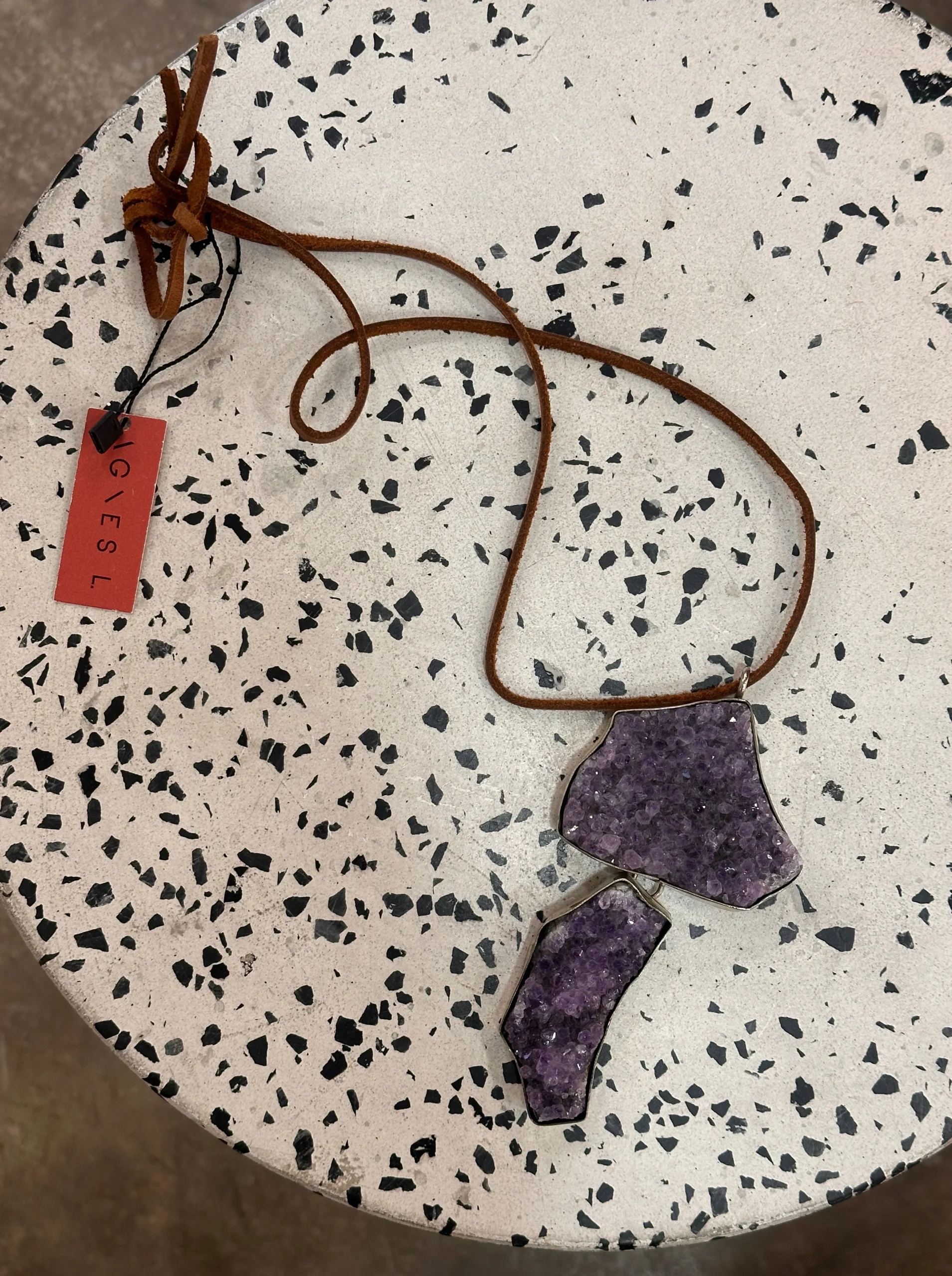 Collar de tiento de cuero con piedras grandes de color morado brillante.