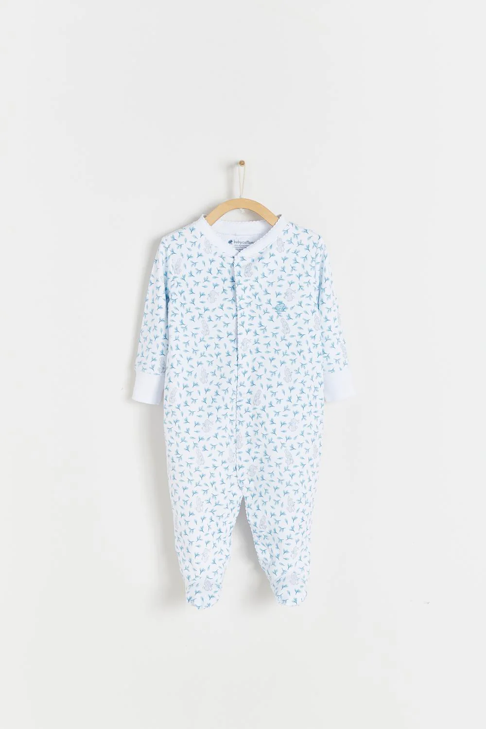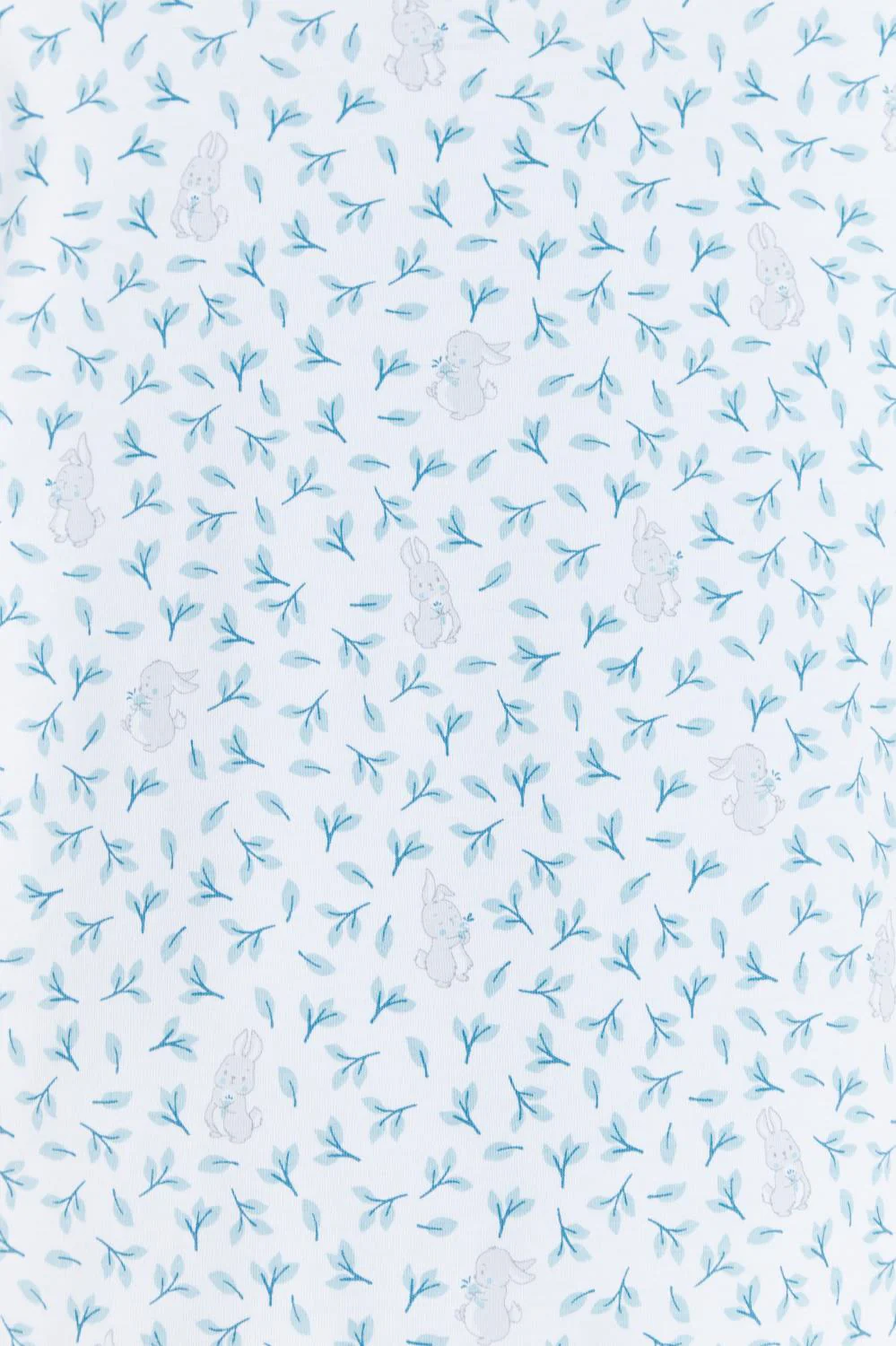 ¡Divino y básico mameluco de estampado de ramas con hojas y tiernos conejos! 100% Algodón Pima Peruano ¡Hecho de la mejor calidad para tu bebe! De cuello redondo, manga larga, cierre de botones a presión delanteros desde el cuello hasta los pies para facilitar su puesta. Diseño estampado y con pies.