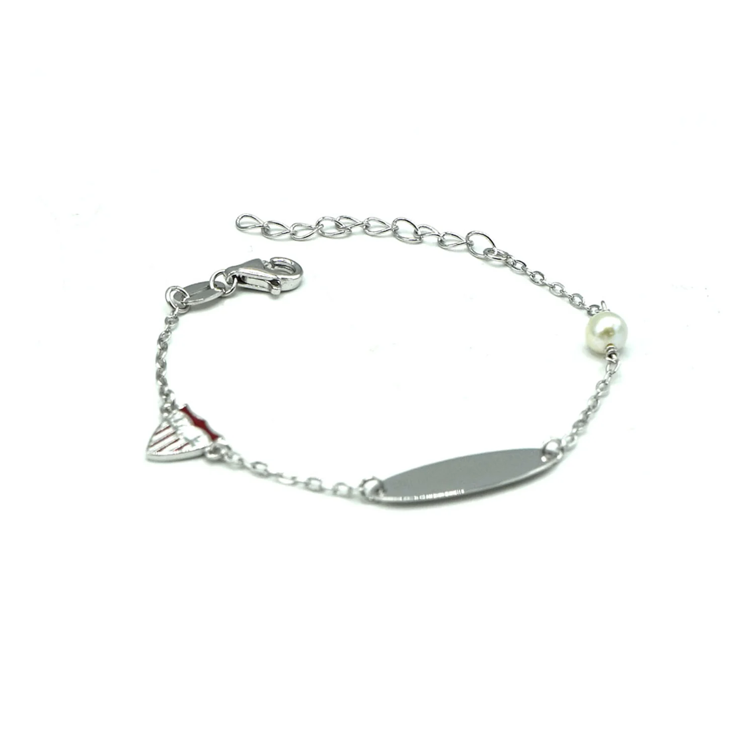 Esclava de plata de ley con cadena fina y placa lisa ovalada para grabo personalizado en el centro, escudo del Sevilla Fútbol Club a color dispuesto en un lateral y una perla blanca en el otro lado. Cierre de mosquetón.