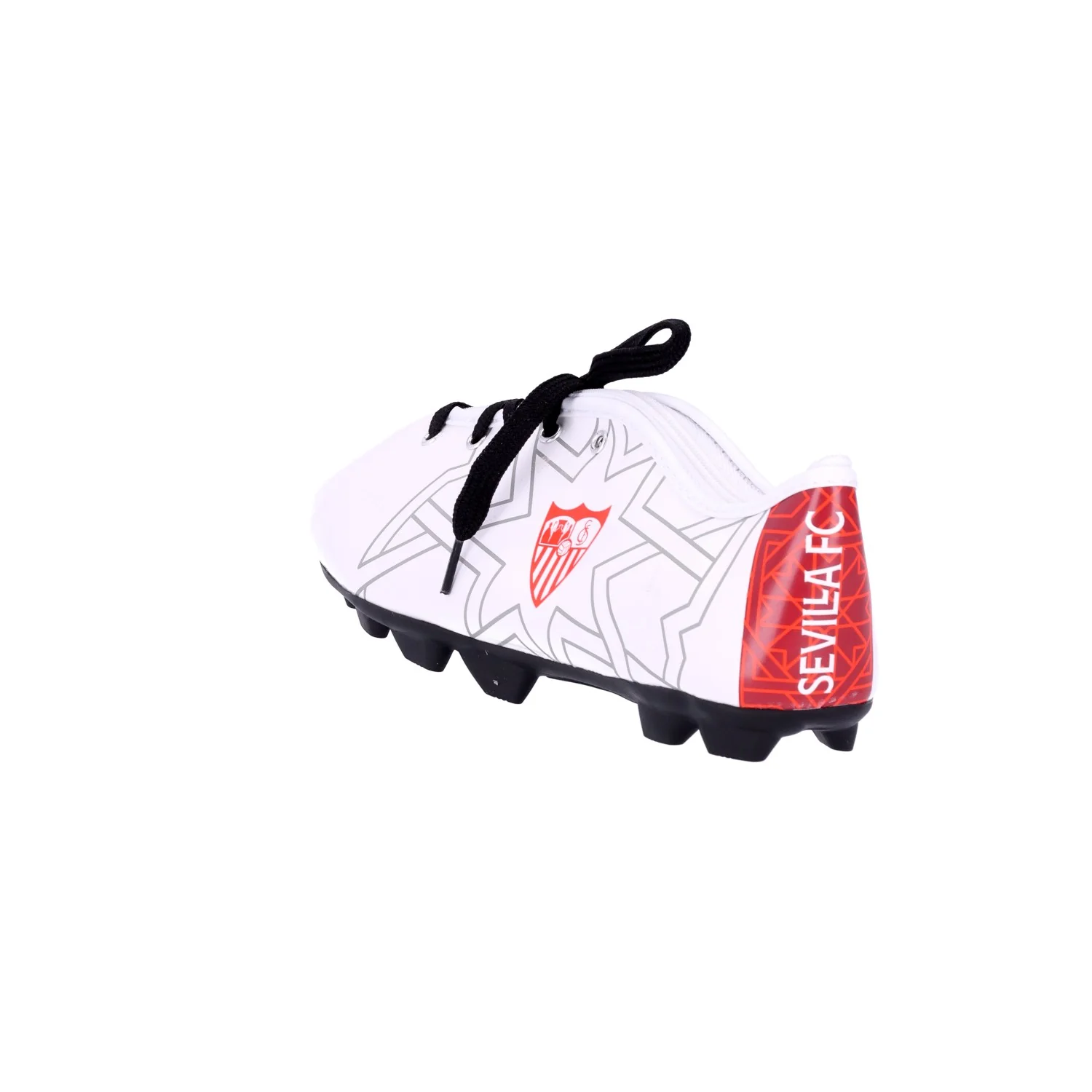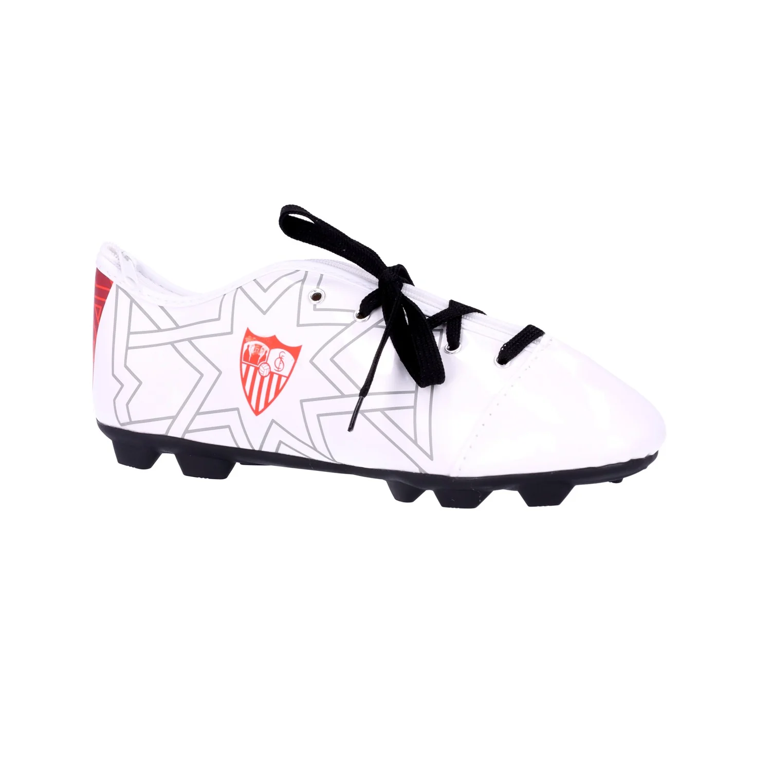 Original estuche con forma de bota de fútbol con cordones y escudo del Sevilla FC en blanco monocolor. Ideal para que los más pequeños de la casa guarden todos los materiales del cole y luzcan su pasión por el Sevilla.