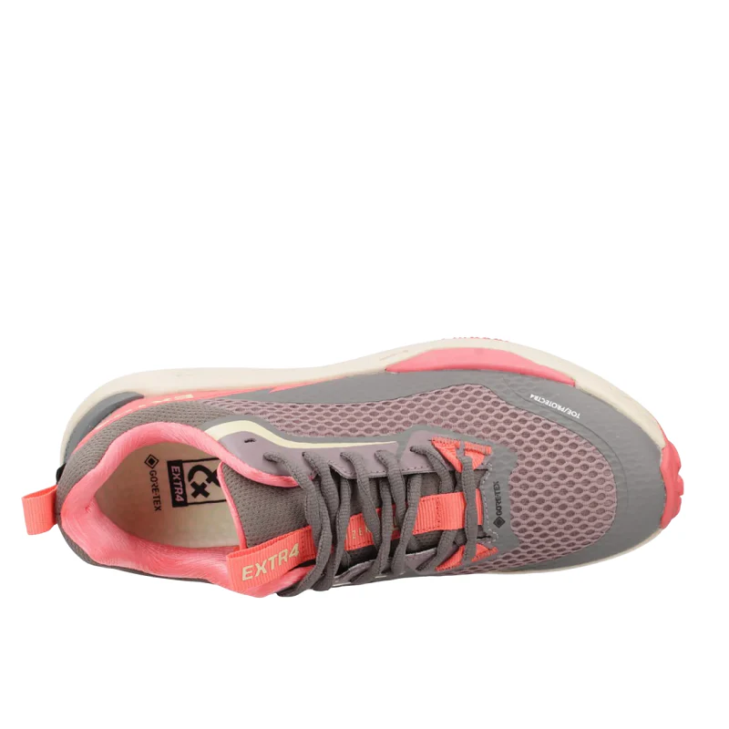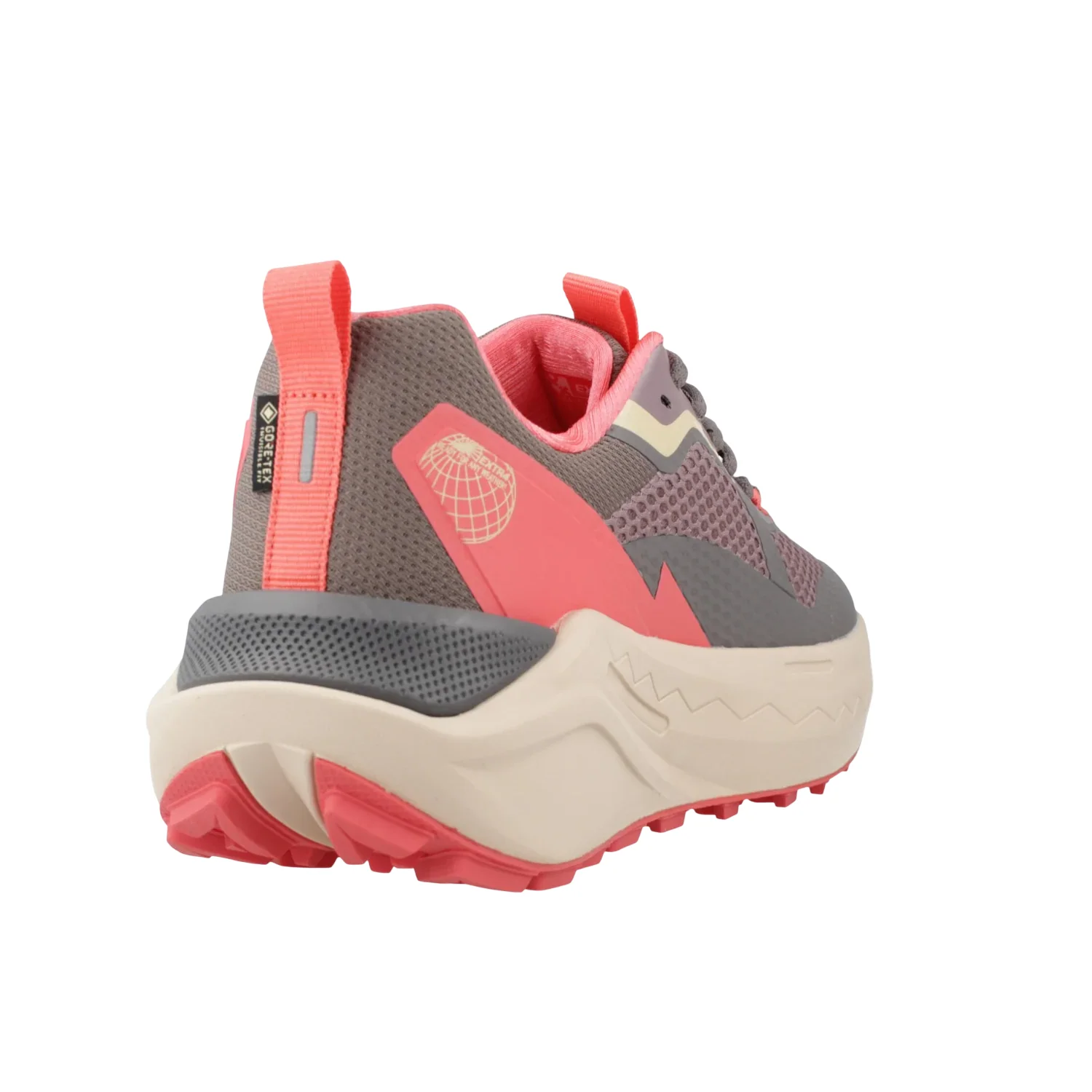 Zapato deportivo de mujer, de aspecto moderno y atrevido, con cierre de cordones. Equipado con Goretex invisible fit, ofrece una protección total impermeable con una sensación de ligereza y transpirabilidad inigualables, manteniendo un diseño esencial y elegante. La suela combina elementos esenciales: una suela con tacos en forma de ‘V’ para una excelente tracción, una entresuela de EVA ultraligera, exclusivas almohadillas amortiguadoras (talón y antepié).