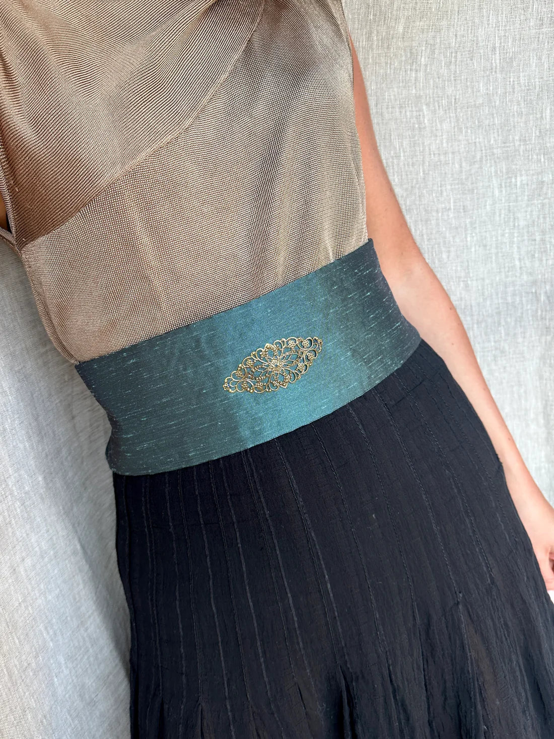 Fajín de seda salvaje azul pato con broche barroco de oro viejo con cinta color cruda