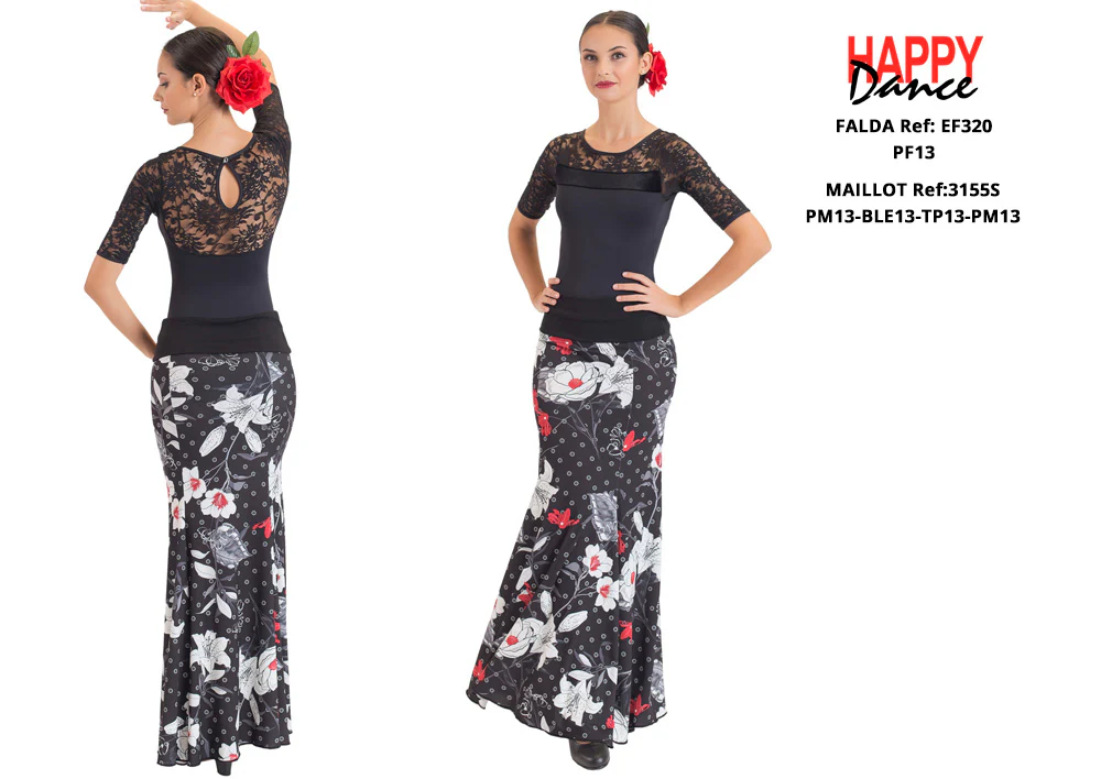 - Falda con flores blancas y rojas sobre fondo negro con fajín negro tejida en punto de lycra.