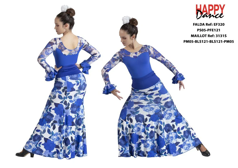 - Falda con fajín en color azulón tejido en punto de seda y palas con flores azules sobre fondo blanco tejida en punto de lycra.