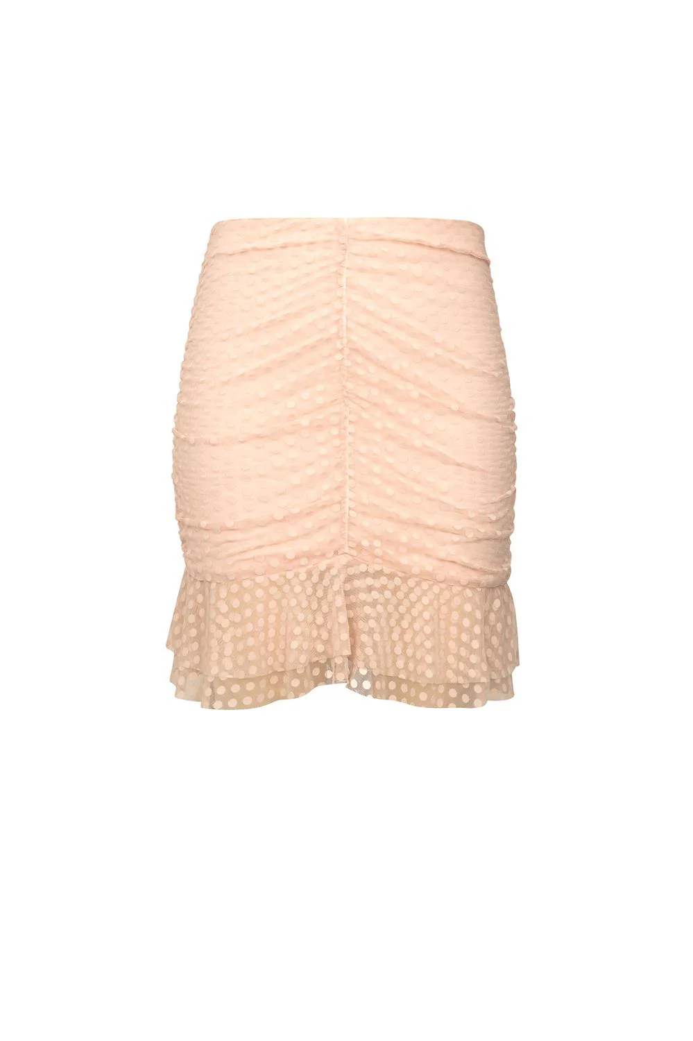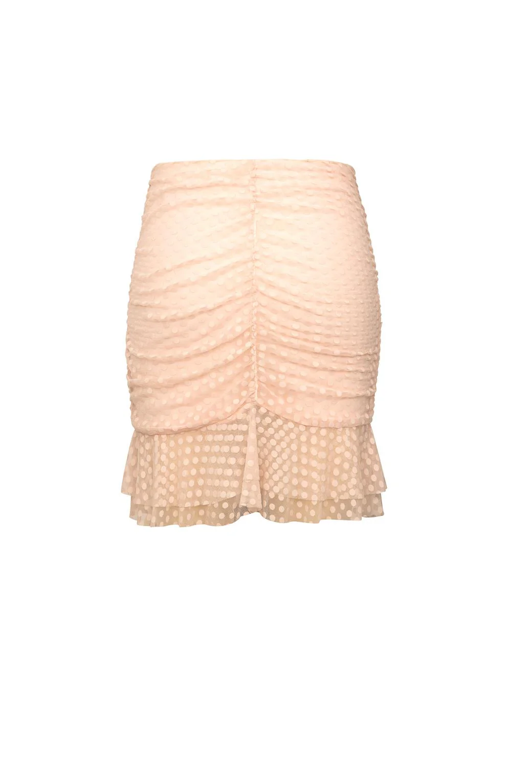 - Falda corta texturizada con elástico en cintura, plisado decorativo y olan en ruedo.