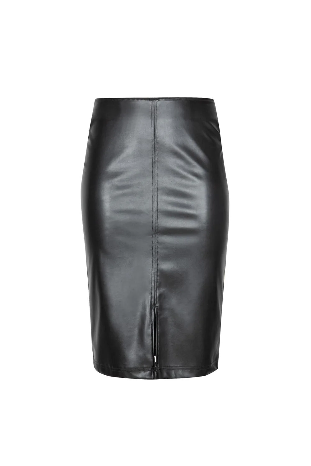 - Falda tubo de efecto piel, costura decorativa central y abertura frontal.