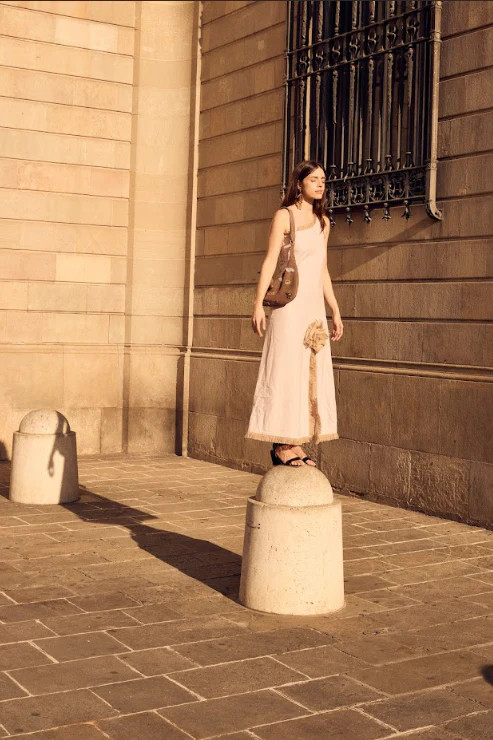 Fabricado en seda lavada de alta calidad, que aporta suavidad y una caída fluida al vestido, con detalles en tela plisada para el aplique de la flor.