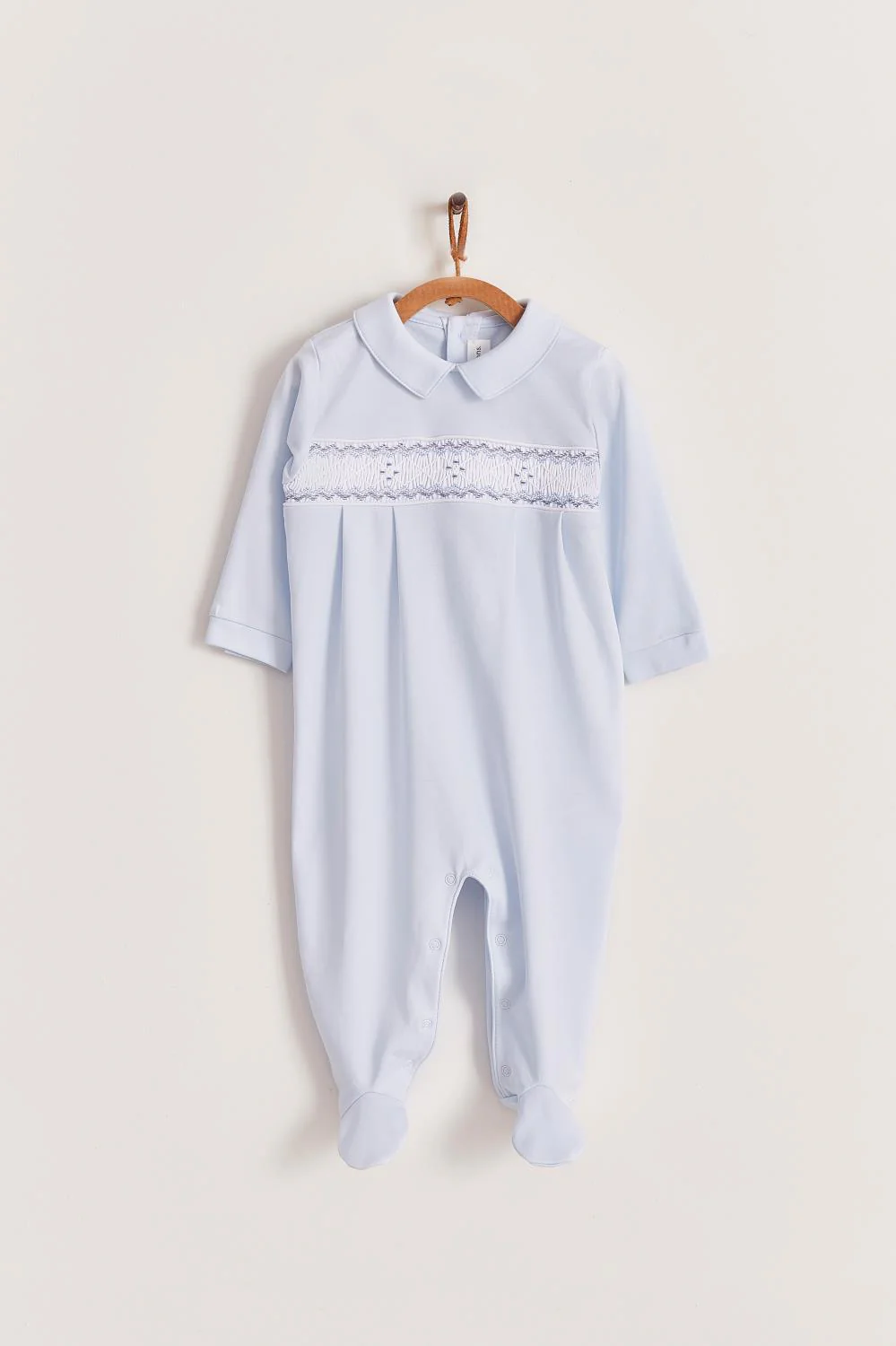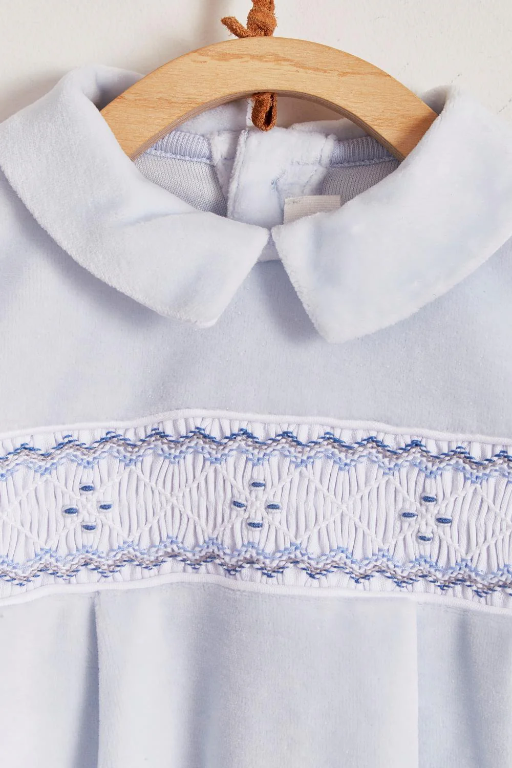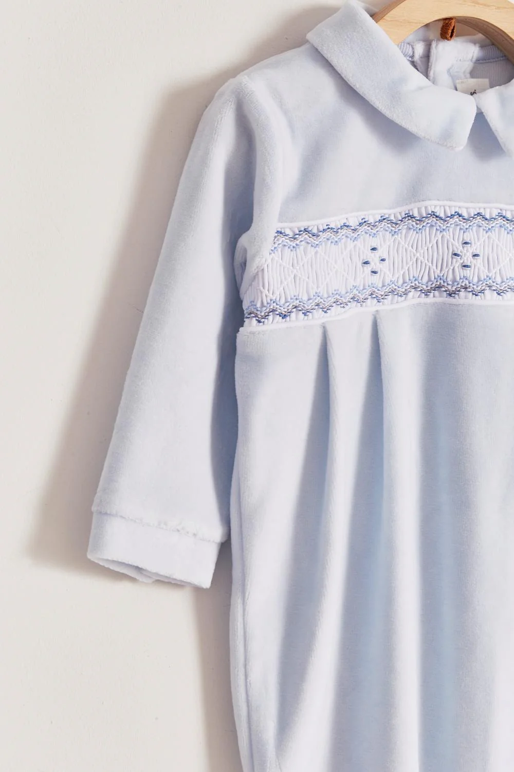 ¡Divino y elegante mameluco con detalle de smock AFELPADO! De cuello camisero redondo, smock en el pecho, manga larga, cierre de botones por atras y cierre de botones a presion en la entrepierna para facilitar su cambio. Tela afelpada en el exterior.