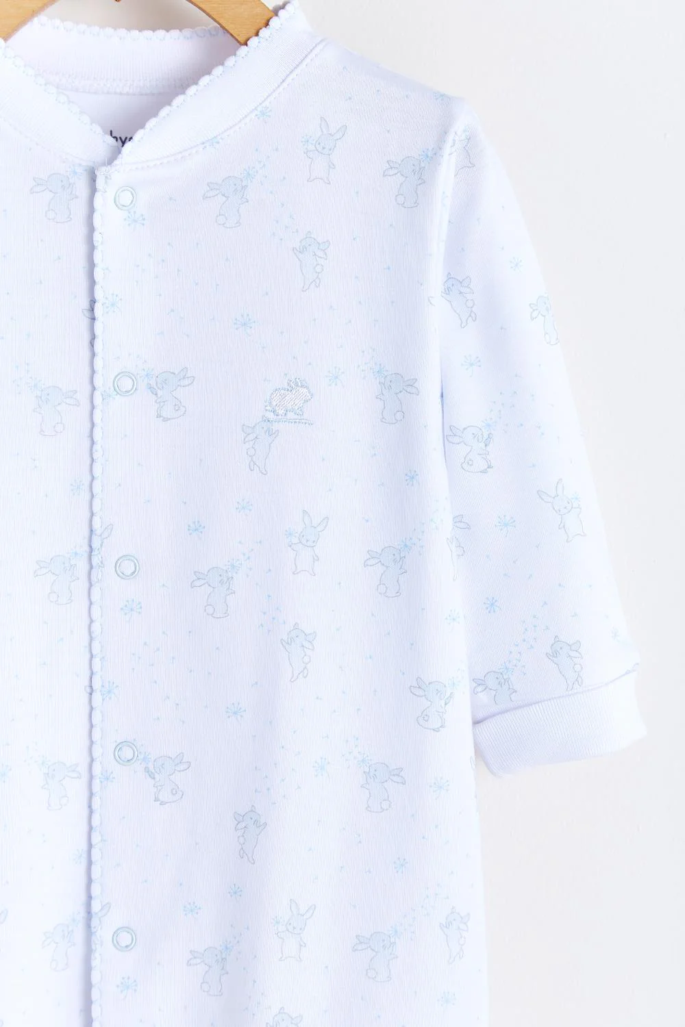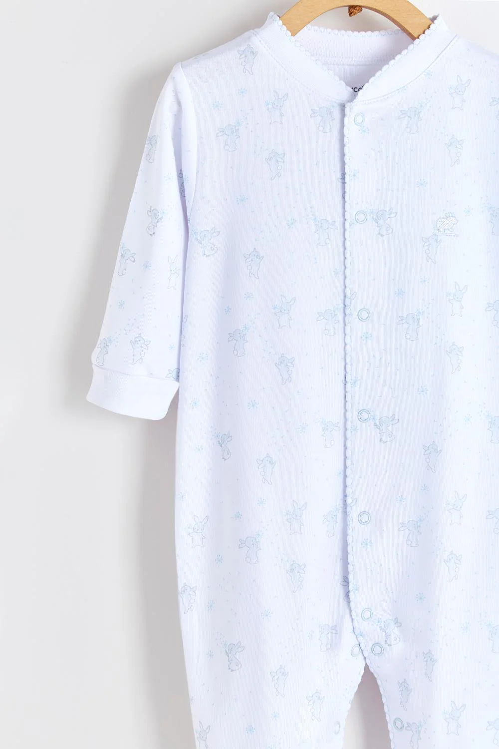 ¡Divino y tierno mameluco estampado con pie de algodón Pima! De cuello redondo, manga larga, cierre de botones a presión delanteros desde el cuello hasta los pies para facilitar su puesta. Detalle de orilla bordada.