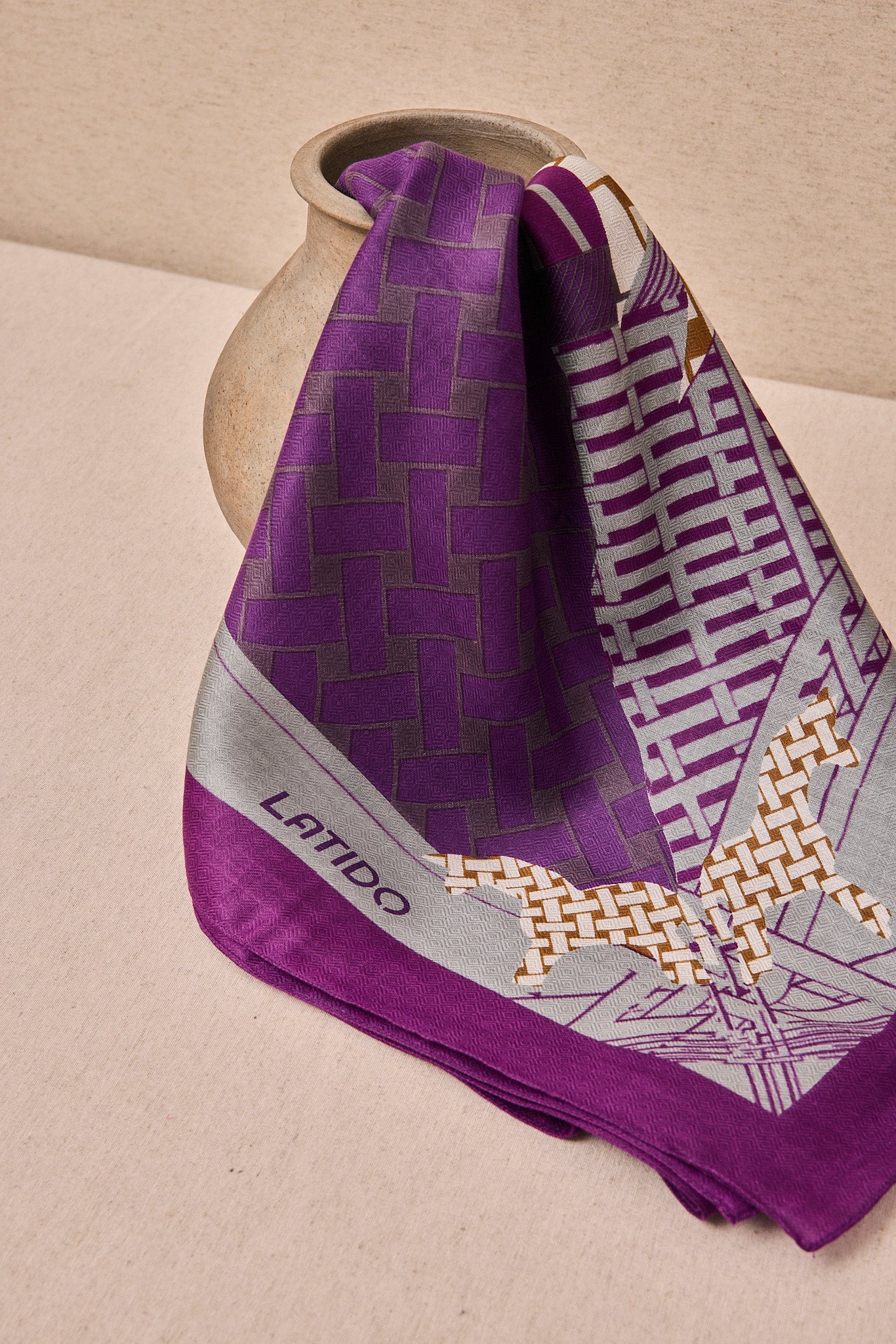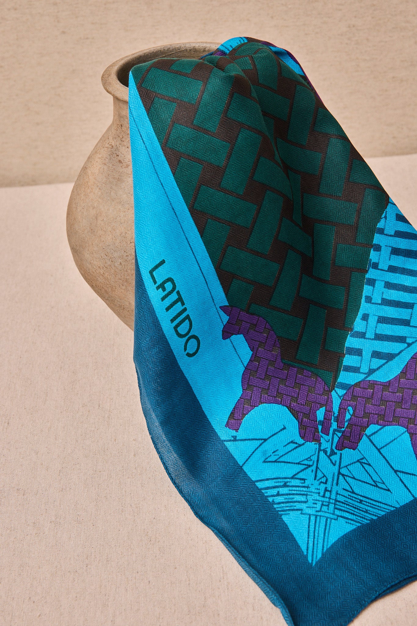 Pañuelo de lyocell con dos cabezas de caballo de perfil, evocando piezas de ajedrez. El diseño combina precisión geométrica con un estilo elegante y distintivo.