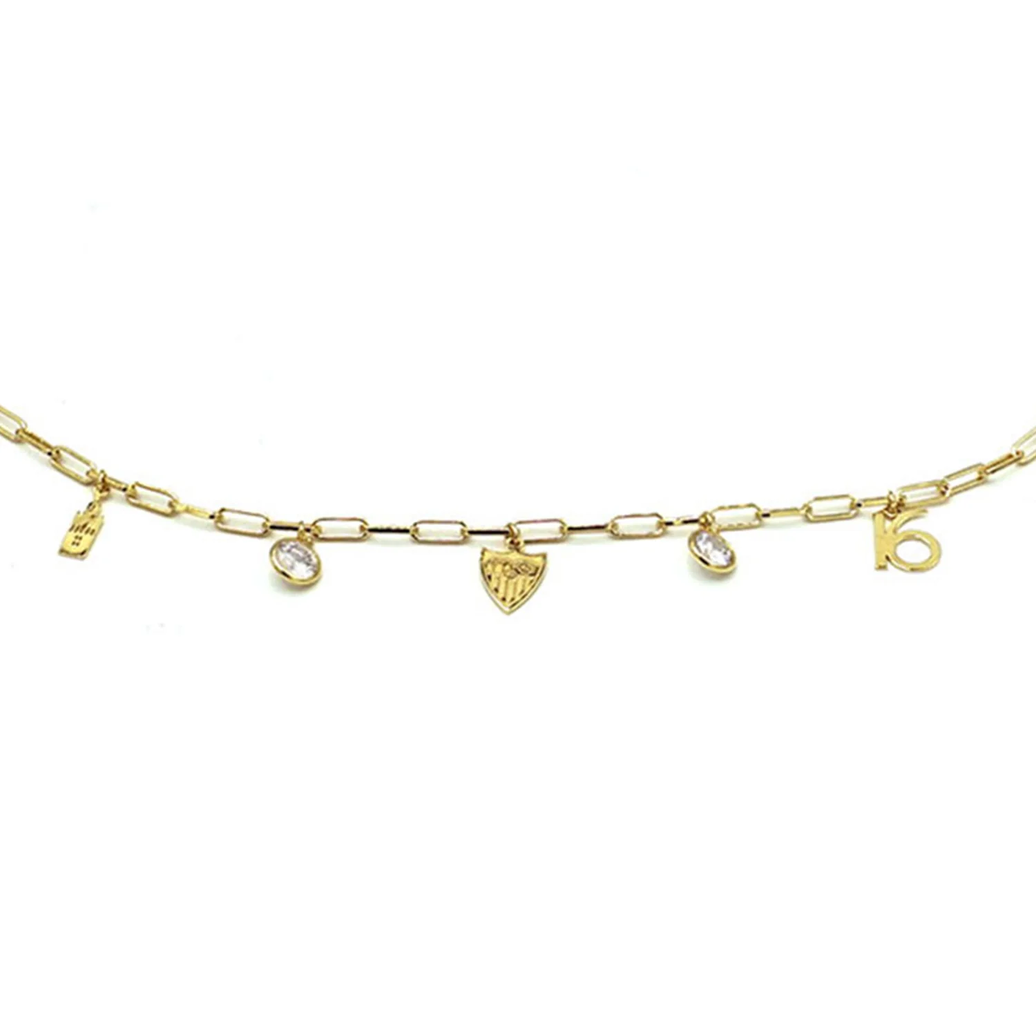 Gargantilla de plata de ley bañada en oro con mini charms colgando; en el centro el escudo del Sevilla Fútbol Club, a un lado la Giralda y una piedra blanca brillante y al otro lado el número 16 y una piedra blanca brillante. Cierre de mosquetón. Medidas cadena: Longitud: 40 cm + 7 cm de alargador. Grueso: 2 mm.