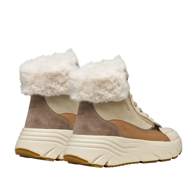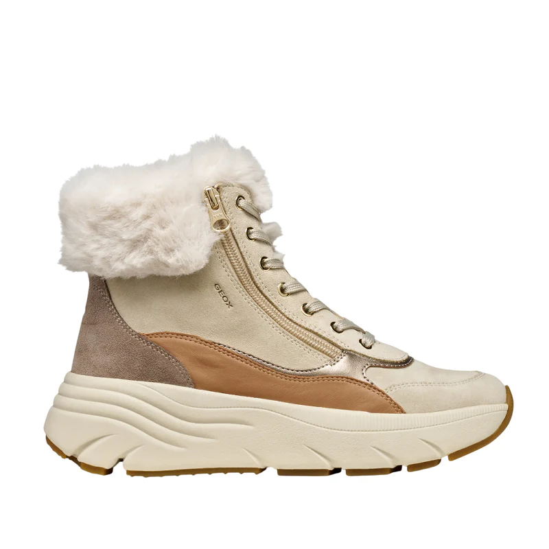 Botín híbrido para mujer con suela gruesa y un diseño cómodo y transpirable. Esta refinada y femenina versión beige presenta un empeine de ante y napa, con ribete de pelo sintético. La opción ideal para días fríos, Diamanta rezuma elegancia deportiva y complementa a la perfección tu estilo casual.