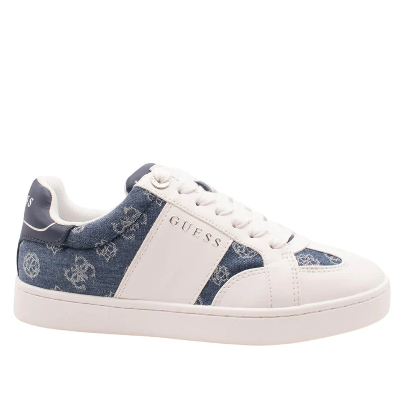 Deportivo de mujer de la marca Guess fabricado en una combinación de piel y otros materiales color blanco con detalle en tejido vaquero.