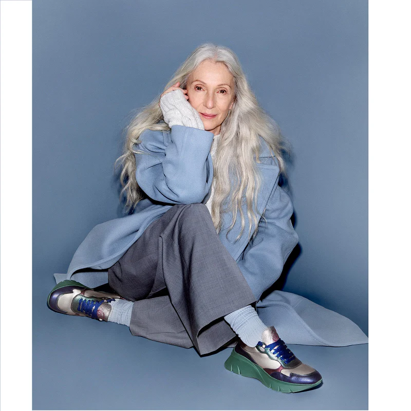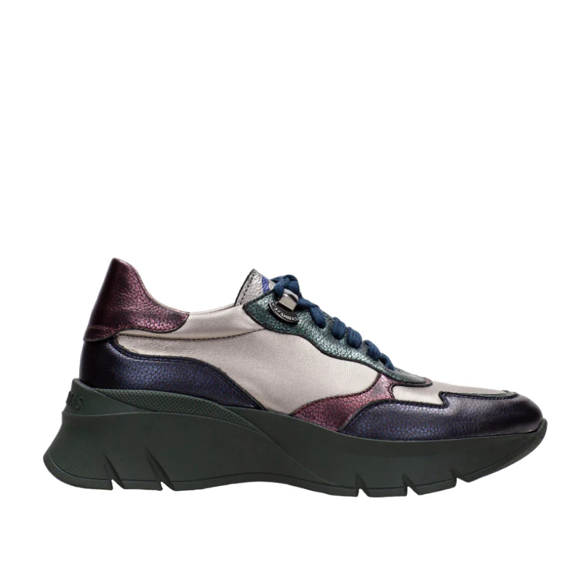 Deportiva con suela volumen de 5 cm, elaborada con una original combinación de materiales formada por piel, tejido de franela y glitter.