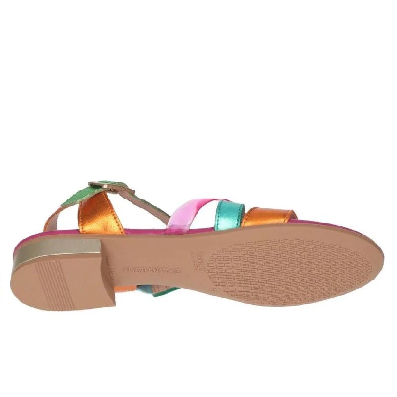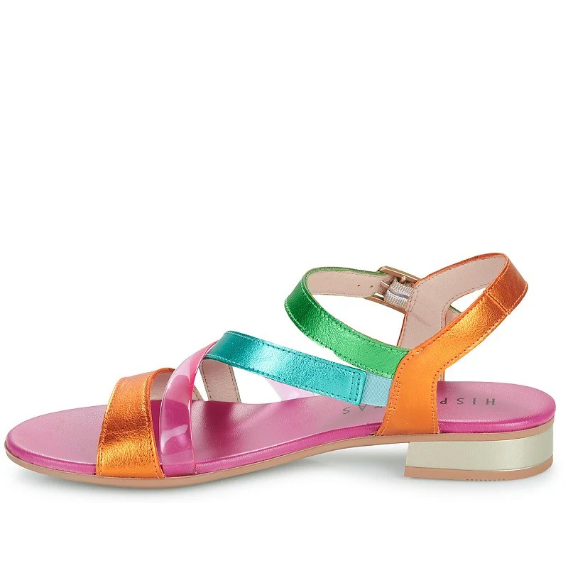 Sandalias de tiras para mujer de piel de la marca Hispanitas. Cómodo corte redondeado. Fabricado en piel metalizada finamente estructurado (una de las correas es de material sintético transparente) una combinación de colores naranja, turquesa, verde y rosa. La correa del empeine tiene una banda elástica cosida en el interior para mejor ajuste y comodidad.