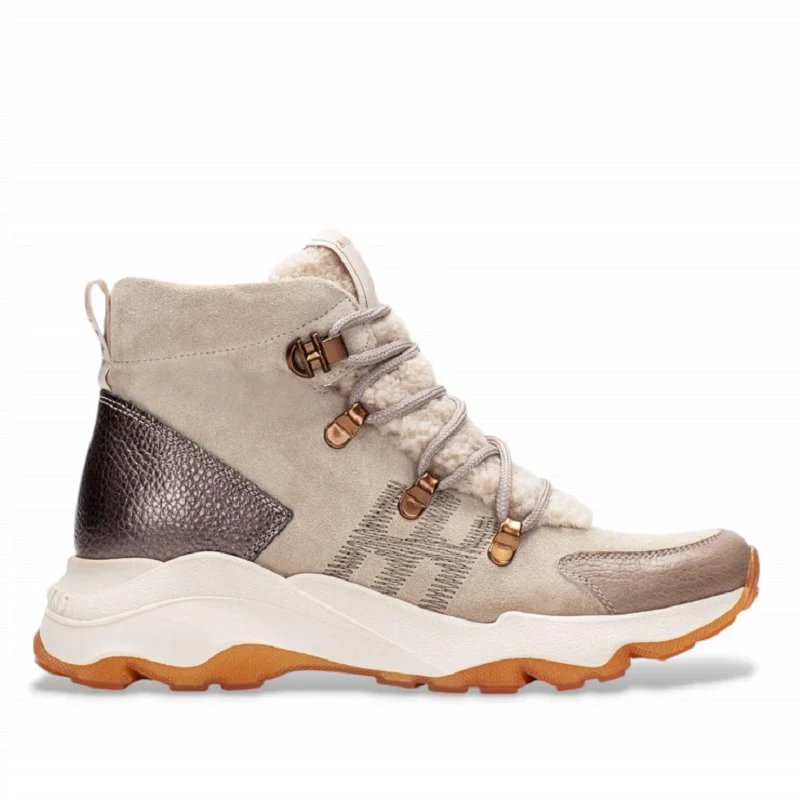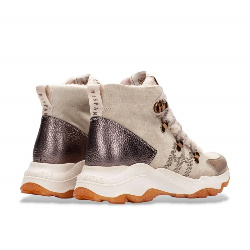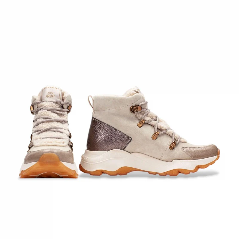 Deportivo abotinado acordonado y lengüeta en tejido de borrego de origen no animal. Detalle doble H en lateral. Piso de 4 cm de goma termoplástica. Elaborado en piel. Forro interior de origen no animal, 100% transpirable y termorregulador. Tecnología Triflow: triple almohadillado en la zona de la pisada que aporta un efecto acolchado al caminar. Incorpora plantilla anatómica extraíble.