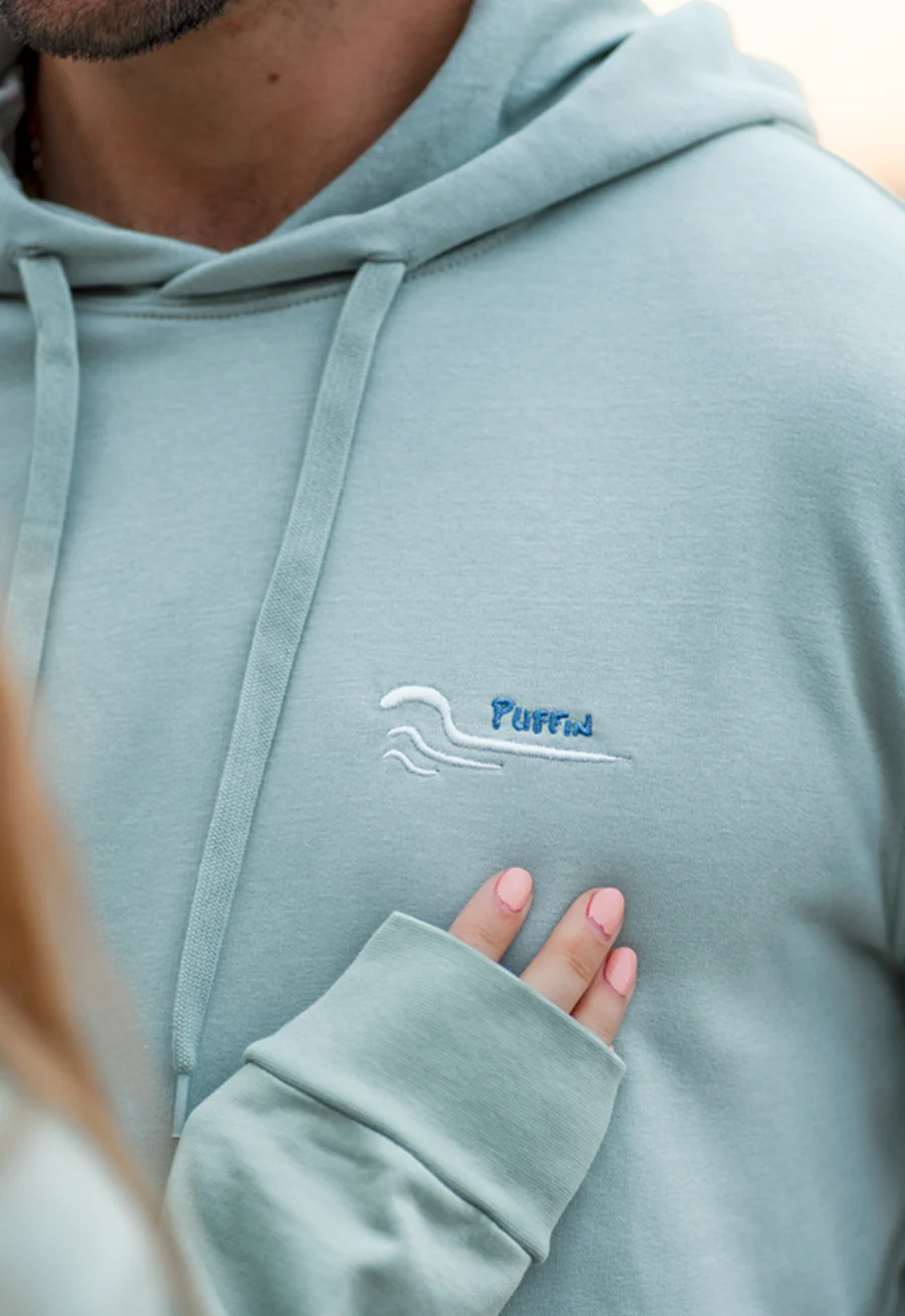 Color verde agua con bordado de olas Puffin en el pecho