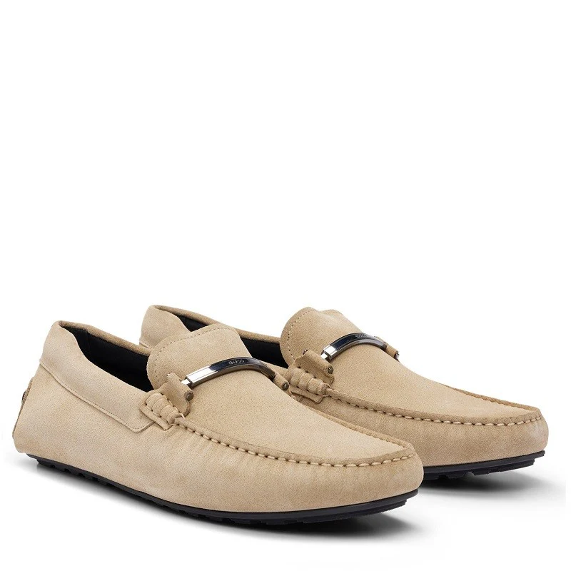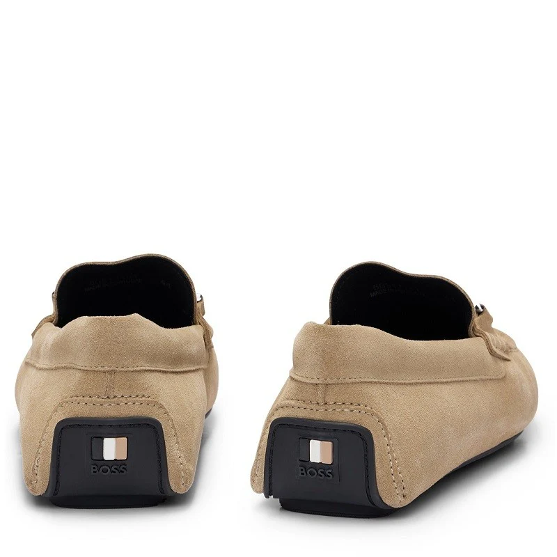 Mocasines elegantes de hombre de la marca Hugo Boss, confeccionados en ante suave con herraje de la marca en el empeine. No tienen cierre y están totalmente forrados.