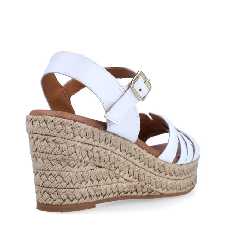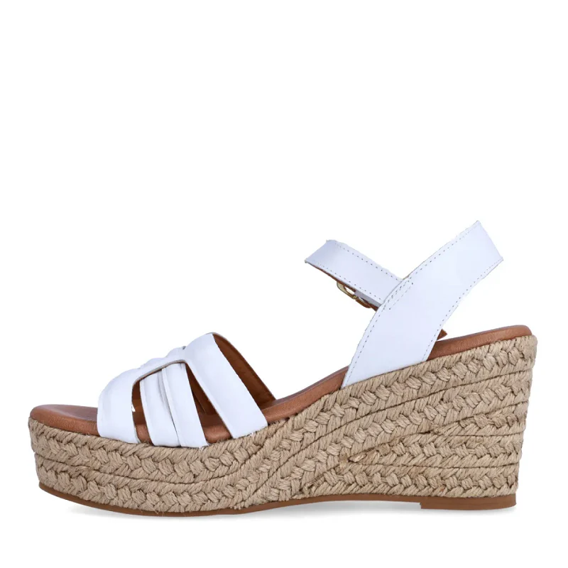 Sandalias de la marca Itse, modelo KARI. Exterior de las sandalias en piel color blanco. Interior de las sandalias en piel color camel. Cierre de las sandalias Itse con hebilla y cuña de 7cm de altura. Estas sandalias Itse KARI son el complemento ideal para crear diferentes looks esta temporada, y sobre todo, gozar de una comodidad espectacular en tu día a día.