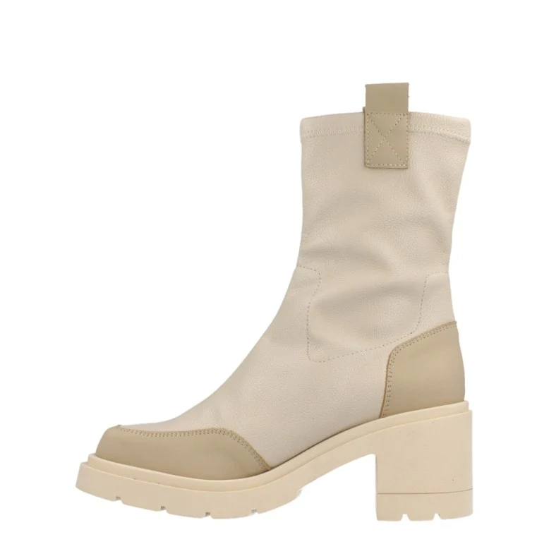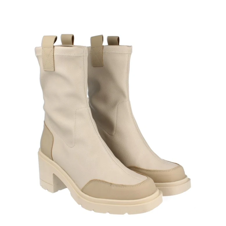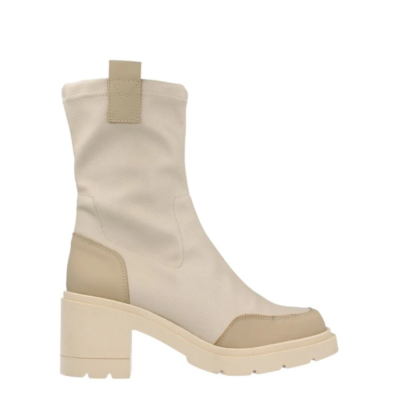 Botín de la marca Itse, modelo Heda. Exterior del botín de piel de color beig y crema. Interior del botín de forro polar de color blanco. Botín con tacón de 6 cm, incluyendo 2 cm de plataforma. Botín con plantilla acolchada para garantizar el máximo confort a cada paso. Botín con altura de caña de 20 cm. El botín Heda de Itse es un botín must-have para esta temporada, ya que es un zapato cómodo, versátil y estiloso.