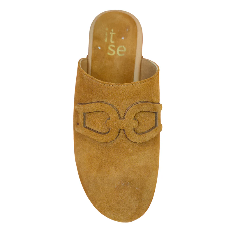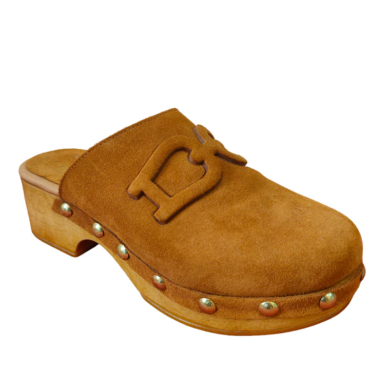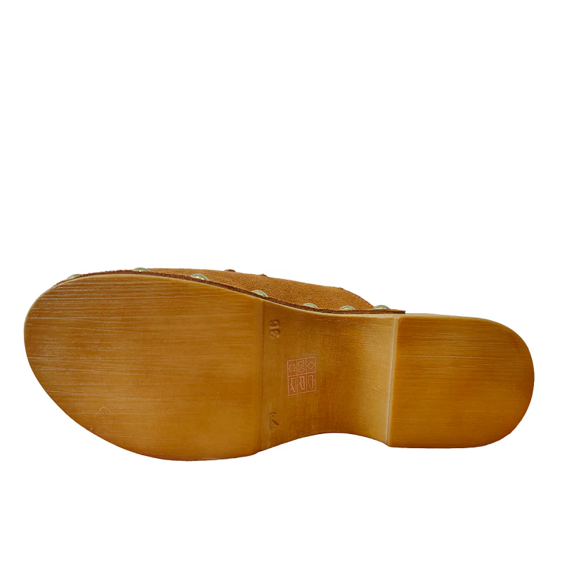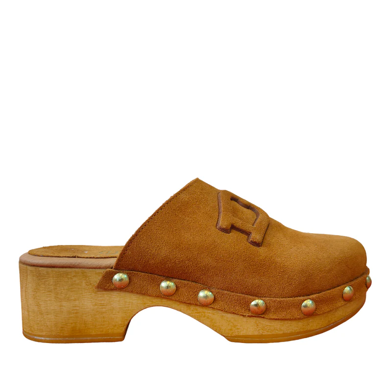 Zueco de la marca ITSE modelo LALA en color MARRÓN en serraje, con diseño en el empeine en forma de cadena grabado en la propia piel. Fabicado en piel sobre suela de madera con tacón de 5 cm y plataforma en la parte delantera de 2,5 cm.