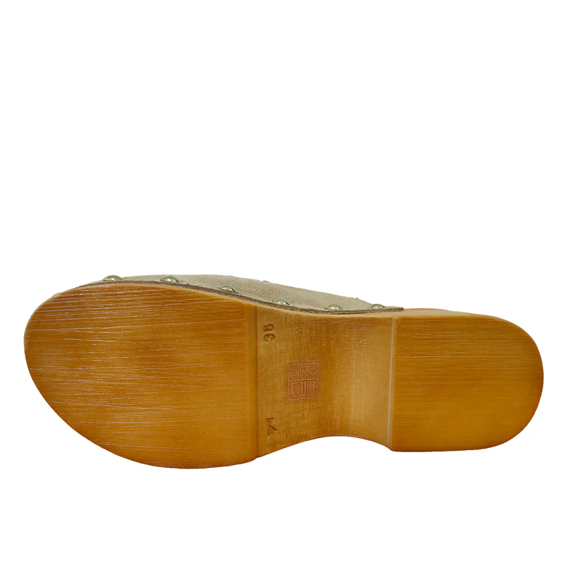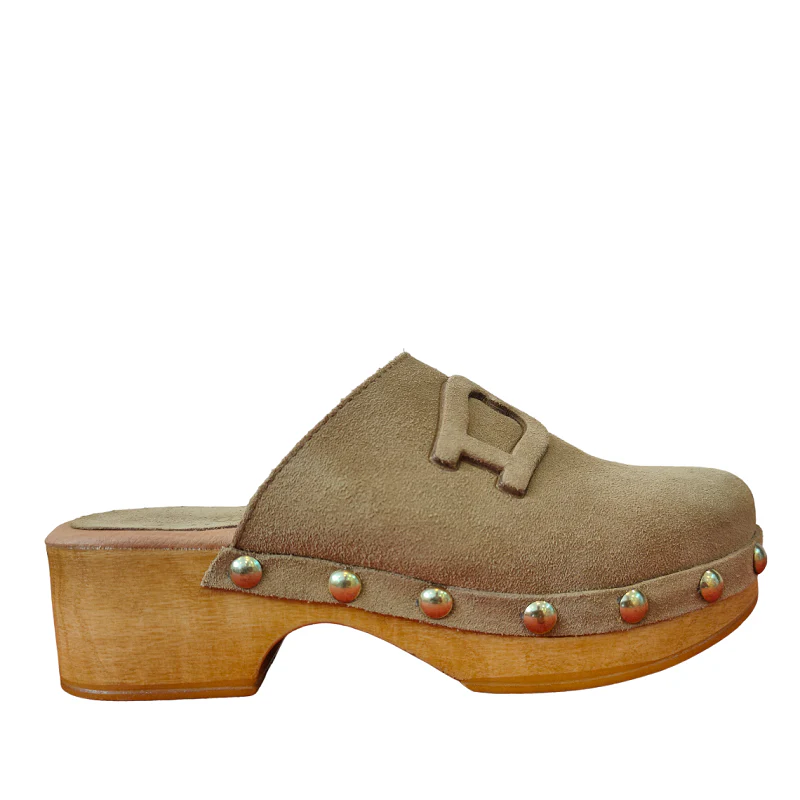Zueco de la marca ITSE modelo LALA en color MARRÓN en serraje, con diseño en el empeine en forma de cadena grabado en la propia piel. Fabicado en piel sobre suela de madera con tacón de 5 cm y plataforma en la parte delantera de 2,5 cm.