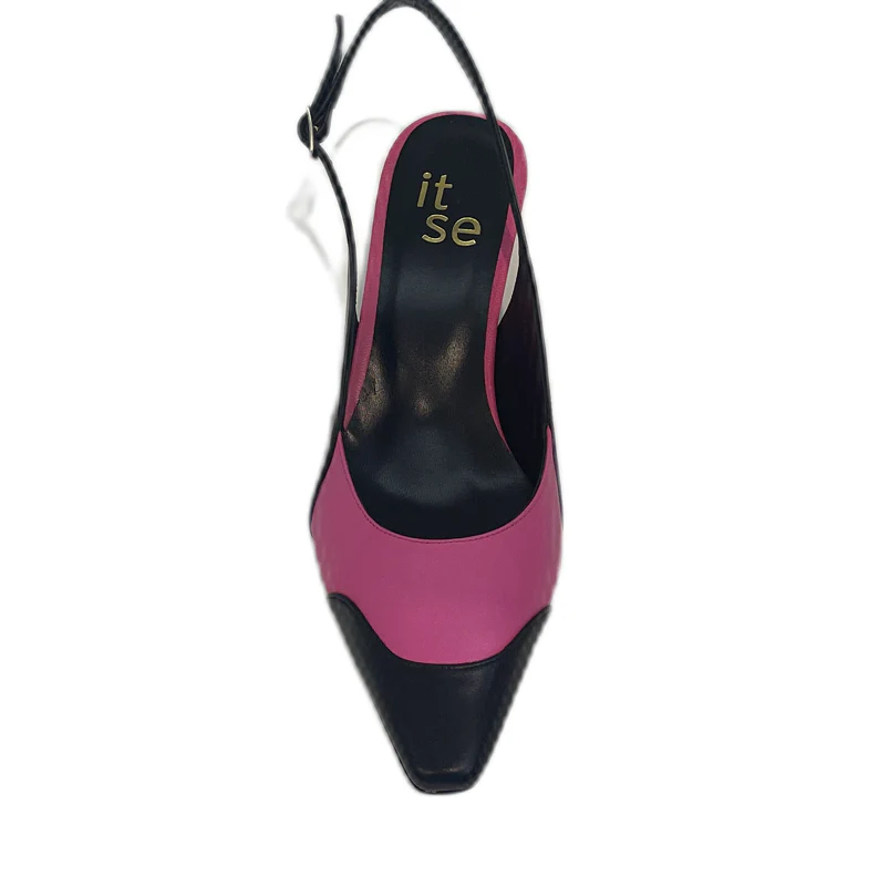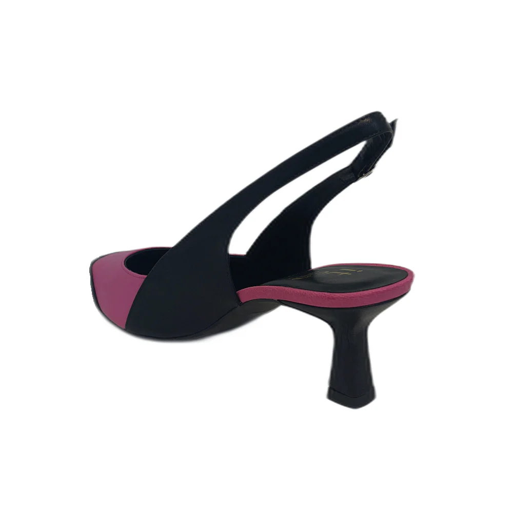 Zapatos de salón bicolor destalonados con tacón en forma de embudo. Fabricados en piel y cierre lateral con hebilla. Calza al estilo de los mejores diseñadores.
