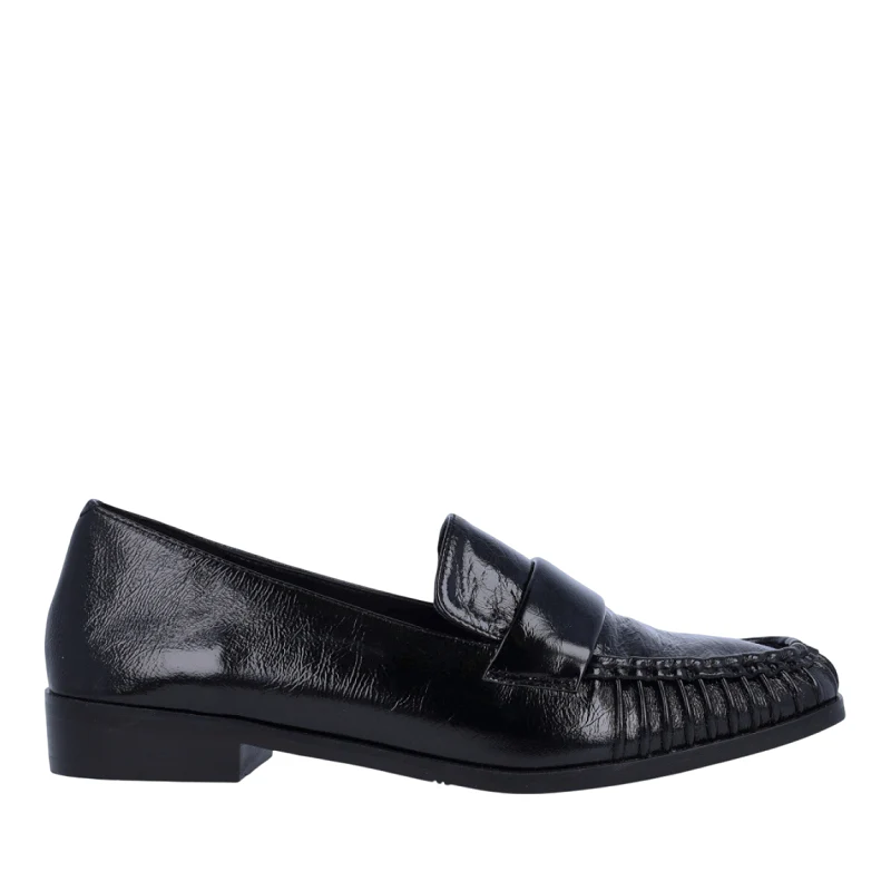 Mocasines de la marca Itse, modelo MOON. Exterior elaborado en piel color negro con detalle de pliegues. Interior en piel color negro con plantilla extraible para máxima comodidad. Mocasines Itse con suela de goma plana. Este modelo MOON es una tendencia, complemento ideal para estilizar tus looks!
