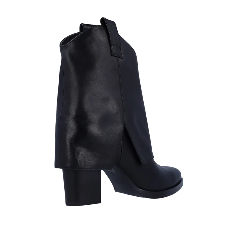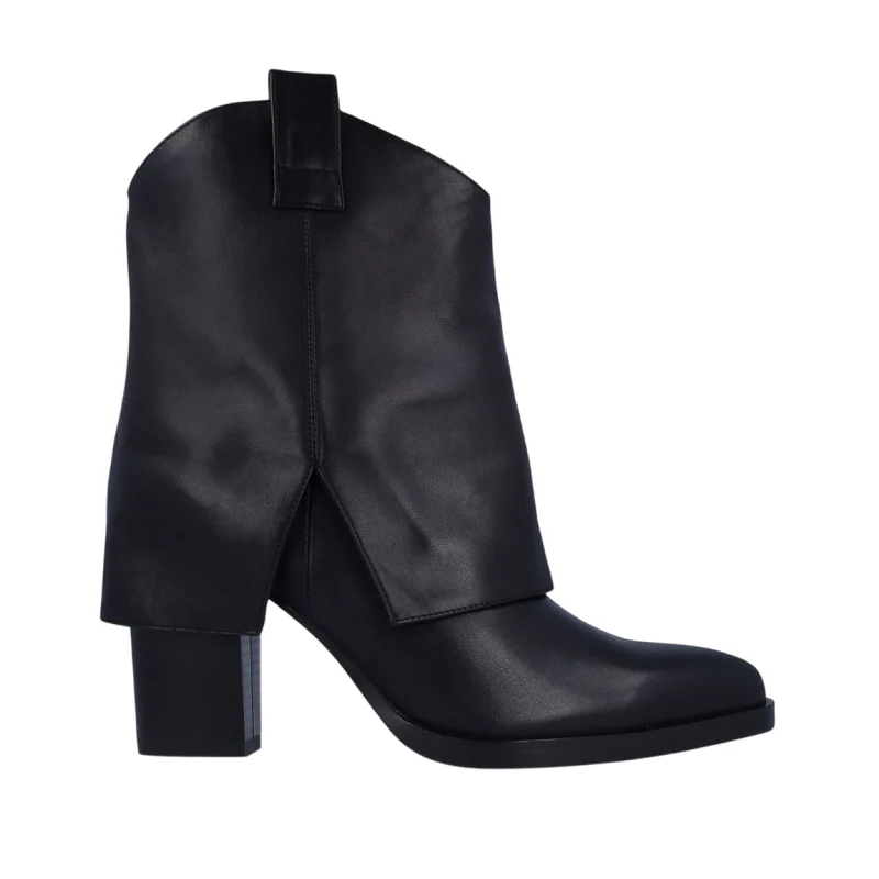 Botines camperos de la marca Itse, modelo RIOTA. Exterior en piel color negro con punta lápiz y caña doblada. Interior en piel color negro. Botines Itse con tacón de 7cm. Estos botines Itse RIOTA son ideales para ti, un complemento perfecto para tus looks de temporada!