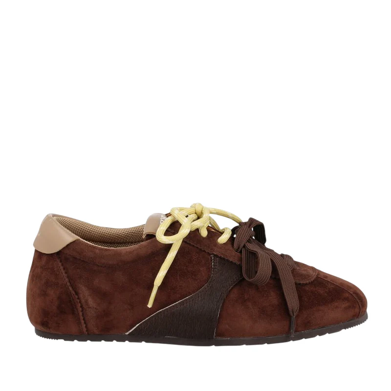 Zapatos para mujer tipo sneaker de la marca Itse fabricados en piel de pelo marrón y doble cordada, la última tendencia de moda esta temporada. Suela de goma