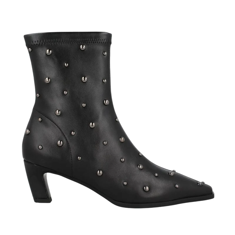 Botines de la marca Itse, modelo TIRANA. Exterior en piel color negro con tachuelas y punta afilada. Interior en piel con plantilla acolchada para máxima comodidad. Cierre con cremallera y una suela de goma con tacón de punta fina de 4cm.