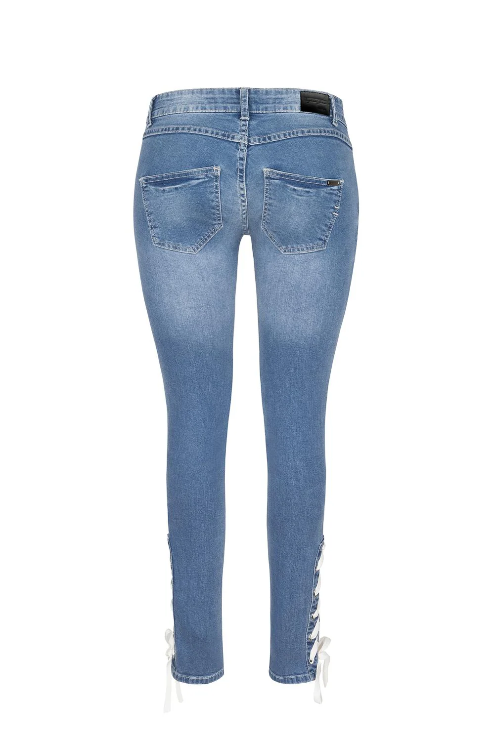 Jeans de mezclilla, tiro medio, pierna ajustada con lazos decorativos en tobillo. 98% Algodón, 2% Elastano prod. # 08-0206