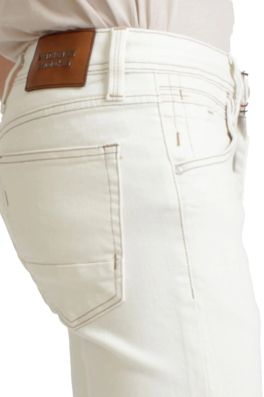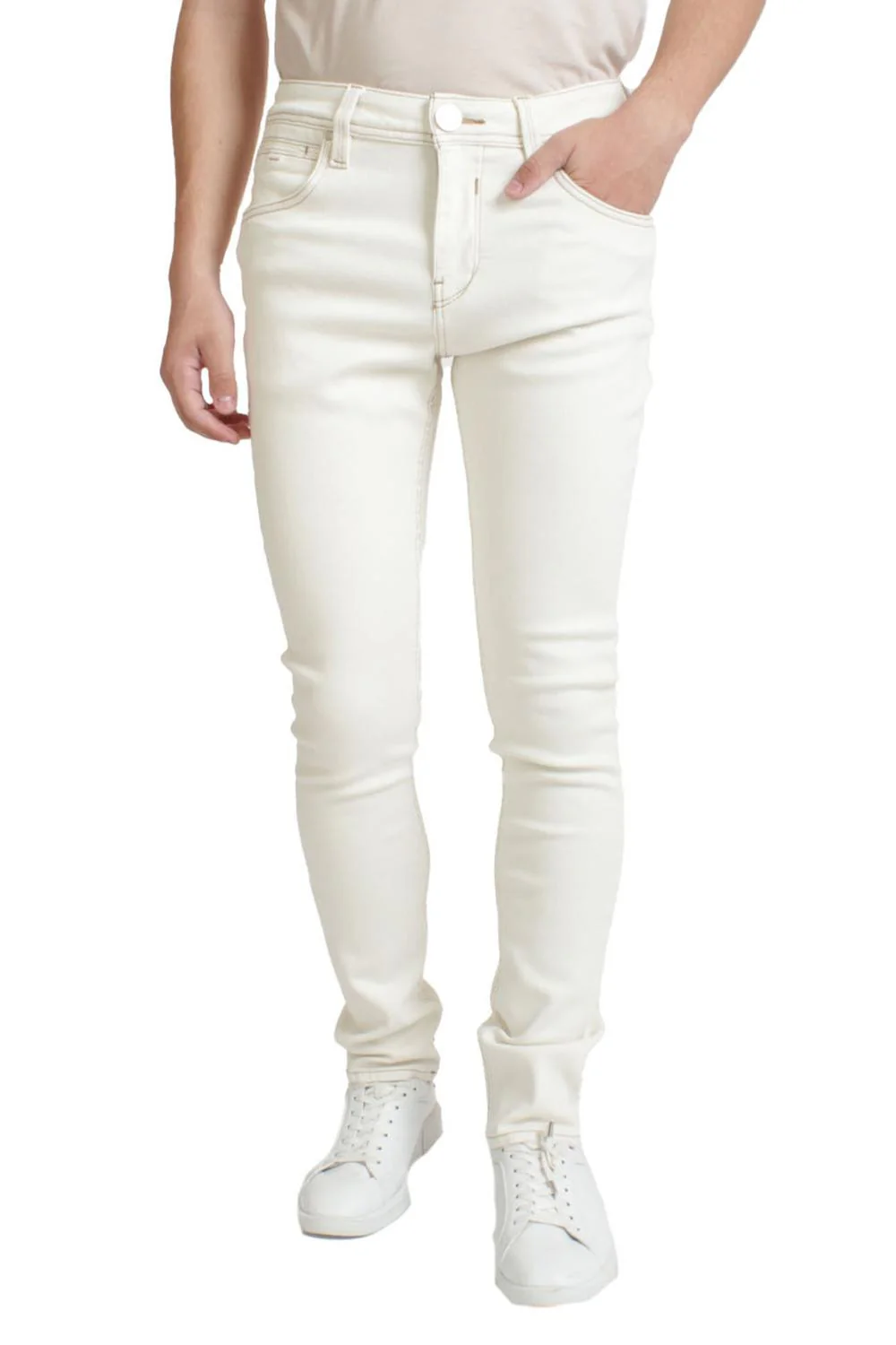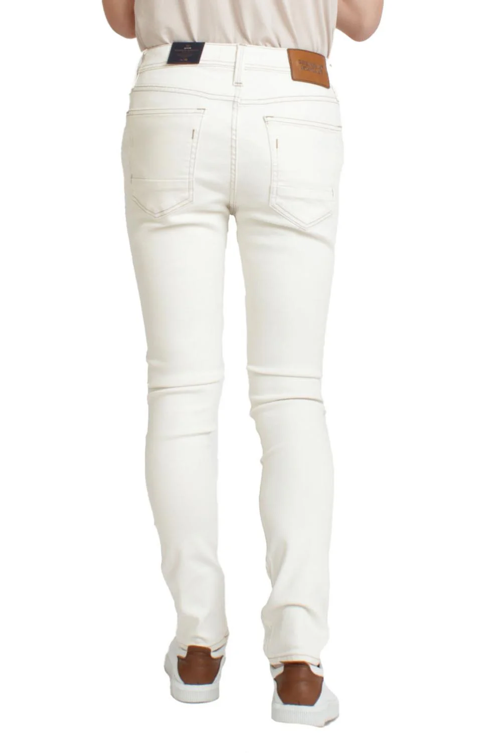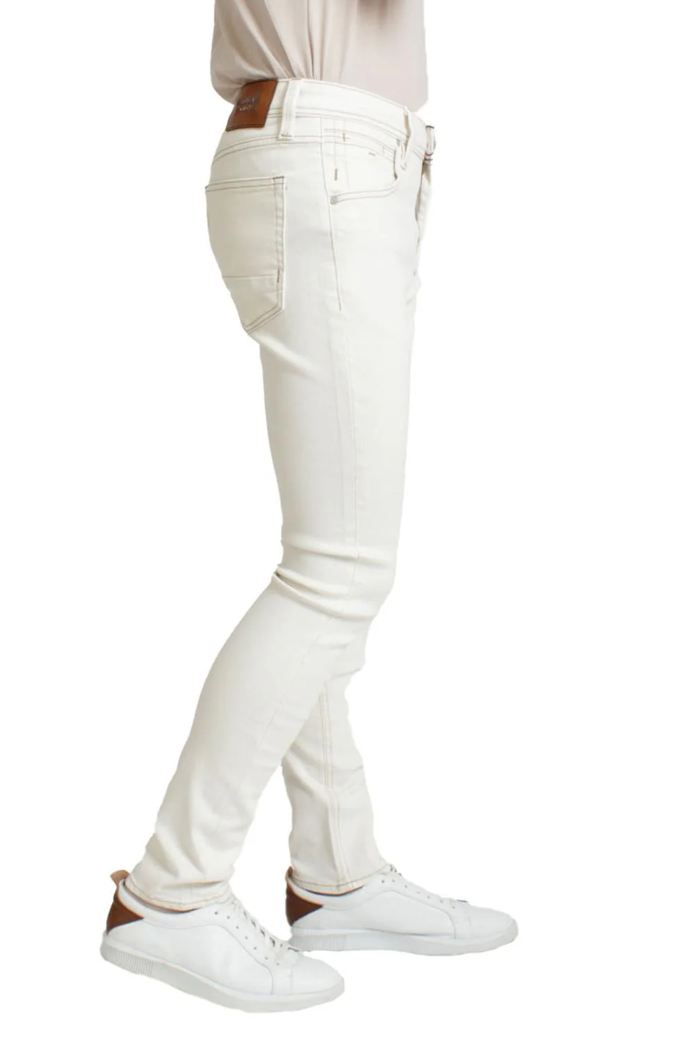 • Jeans corte slim fit, cinco bolsillos, efecto de lavado, cierre frontal con cremallera y botón, detalle en aletilla.