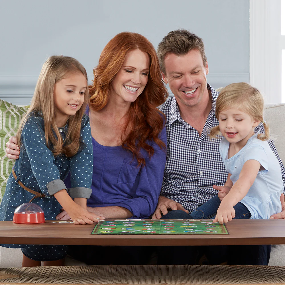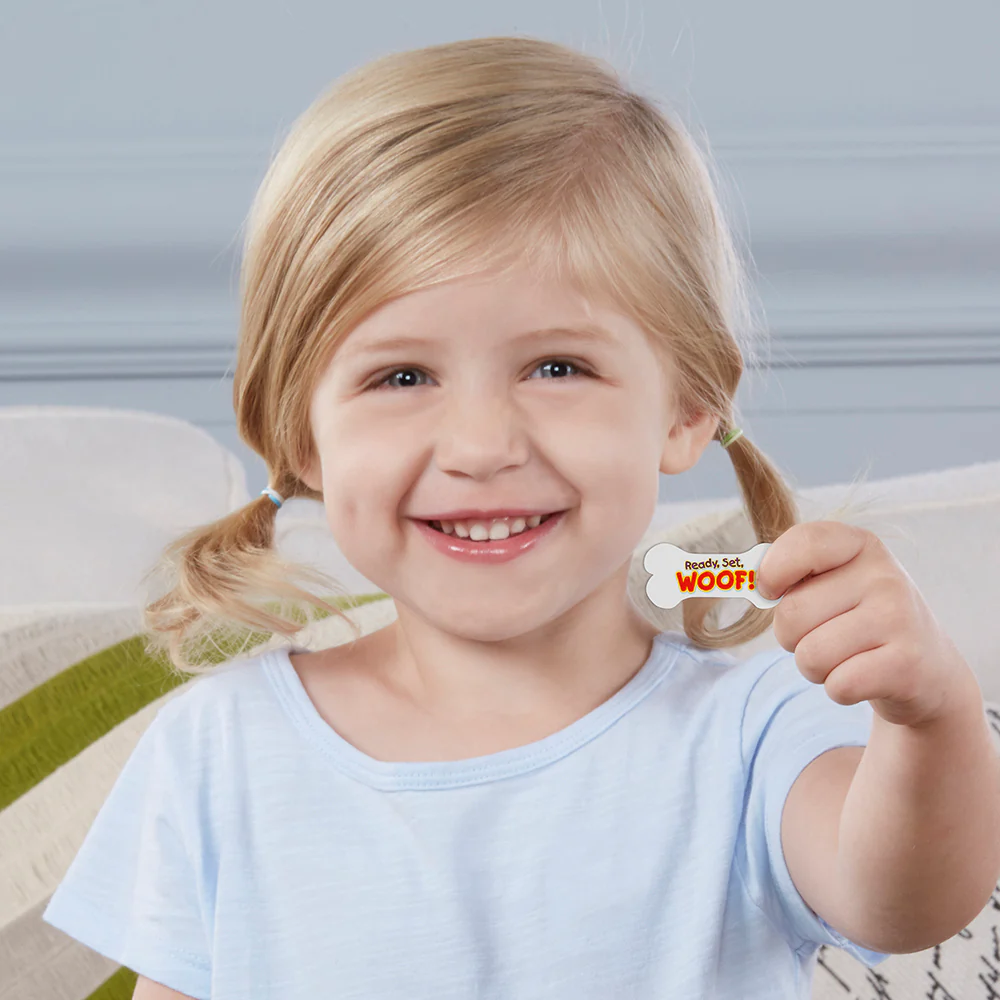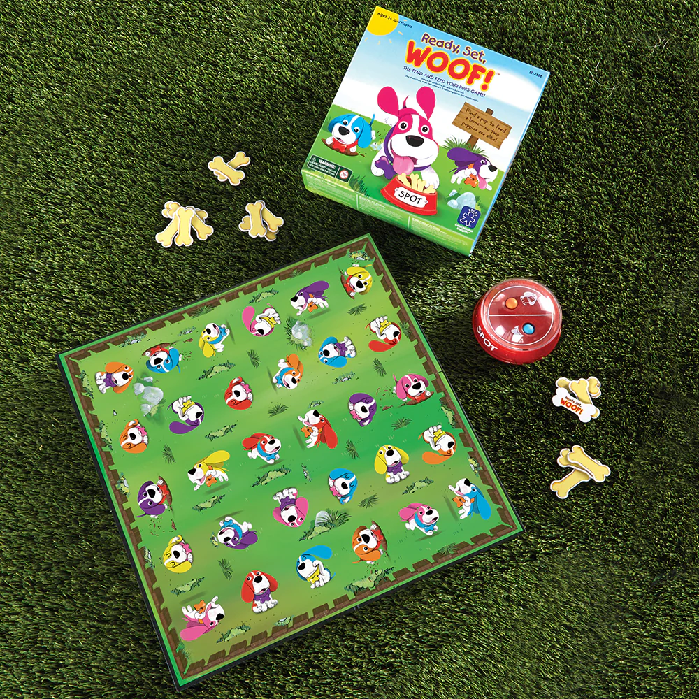 ¿Listos? preparados ¡juego de woof! ¡Los cachorros hambrientos están corriendo salvajes en el parque y necesitan que los alimenten con los sabrosos huesos! Agita el boton para averiguar qué cachorro debe obtener un hueso. Fijate muy bien que deben coincidir los colores salidos aleatoriamanete en el boton con el perrito en el tablero. Encuentra tu cachorro primero y aliméntalo con su hueso ¡El primer jugador que se quede sin huesos, gana!