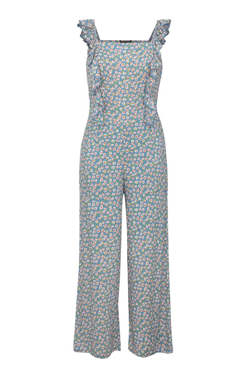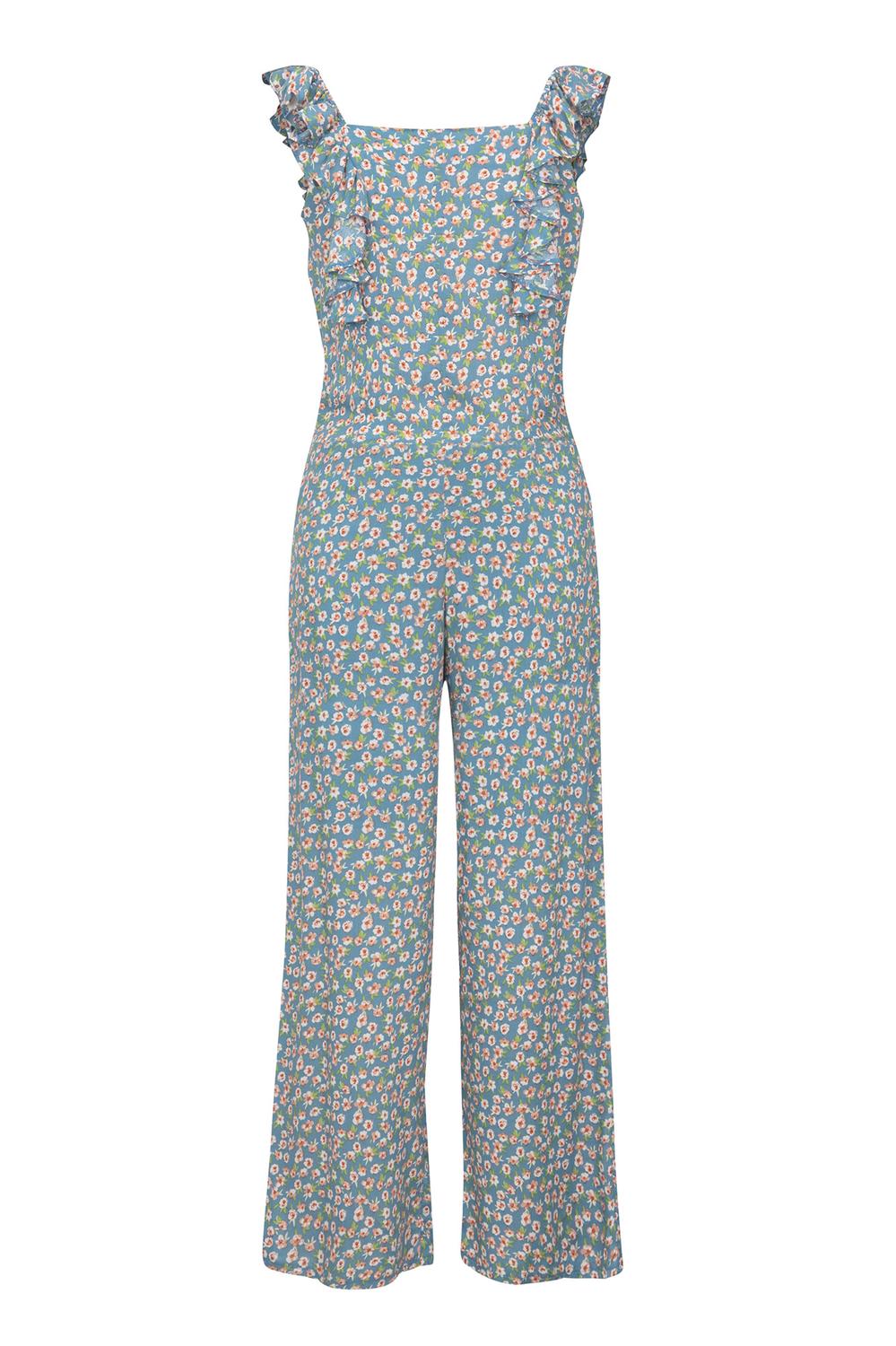 Jumpsuit estampado con olán en tirantes, corte en cintura y pantalón con largo. Código de producto 33-0123