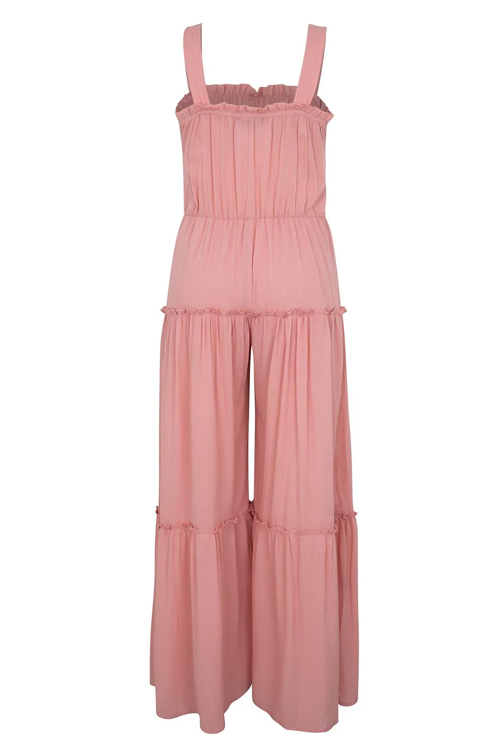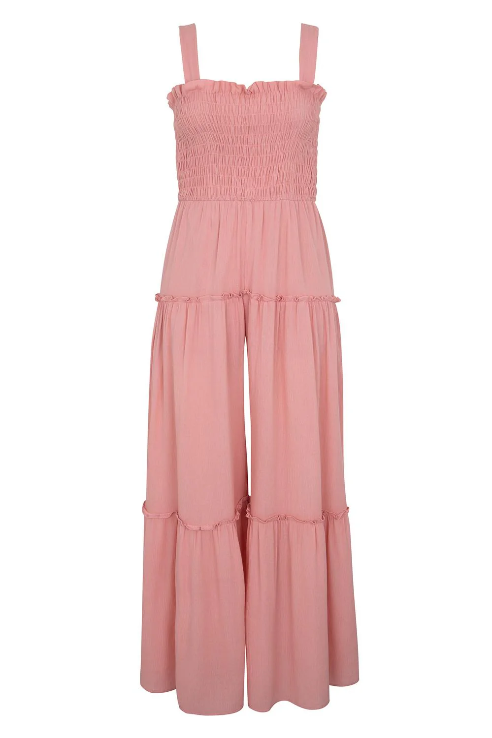 - Jumpsuit largo de pierna ancha, tirantes, smock en talle delantero, elástico en cintura y múltiples cortes decorativos.