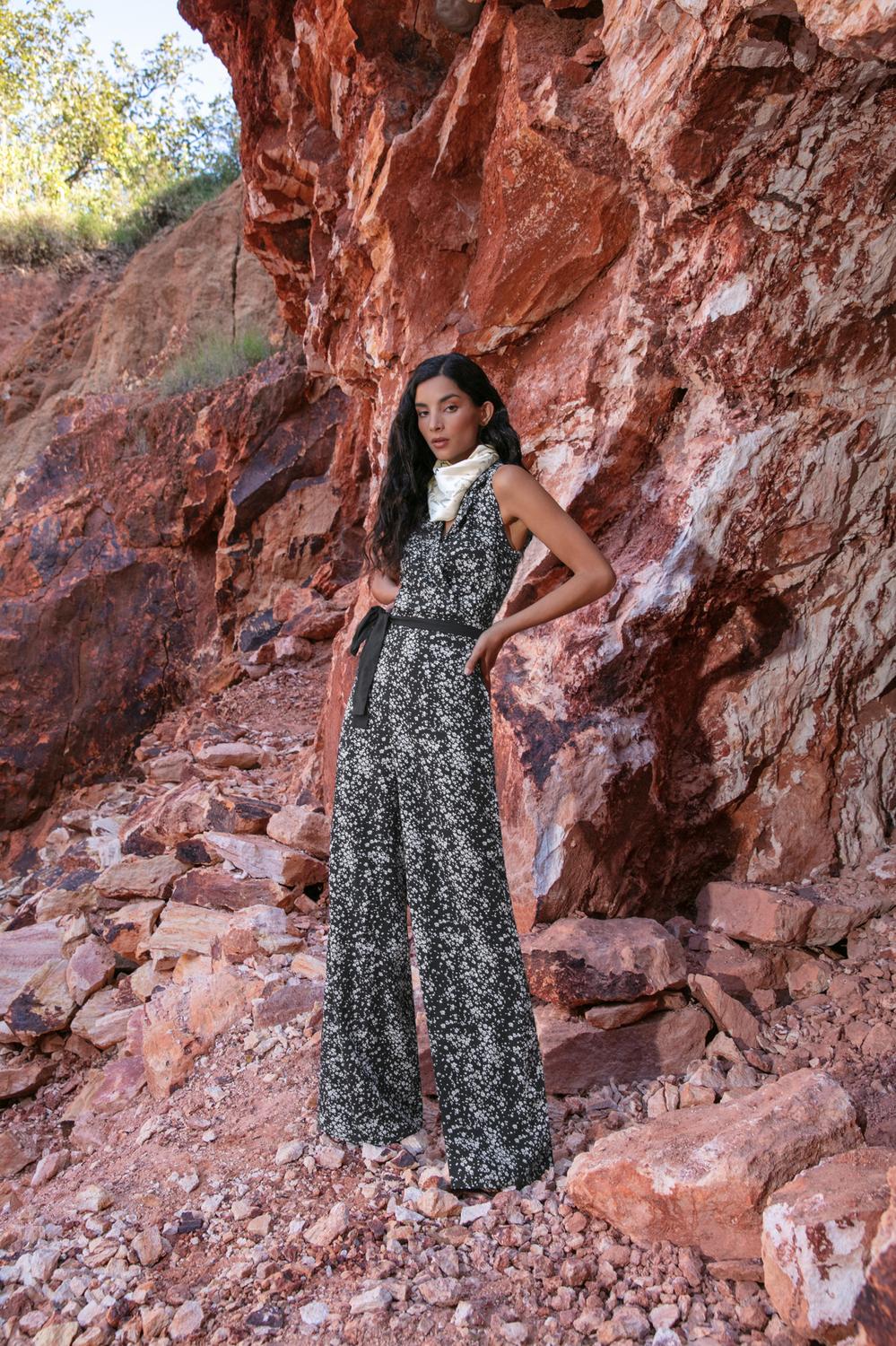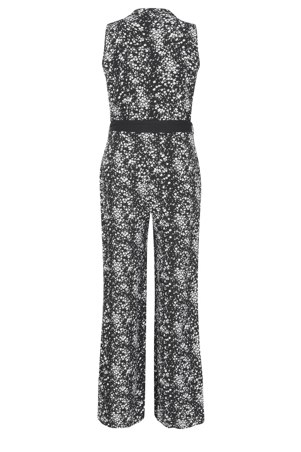 Jumpsuit estampado con solapa, pleats en cintura, cierre en costado, pretina y lazo de la misma tela.prod. # 33-0111