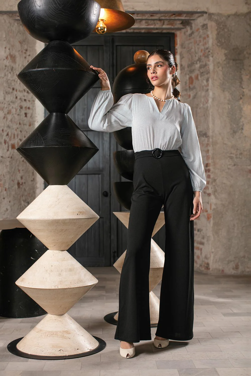 Jumpsuit largo estampado con escote redondo, escote frontal, plisados decorativos, corte de piernas anchas, cinturón ajustable y mangas largas con elástico en puños. 33-0153