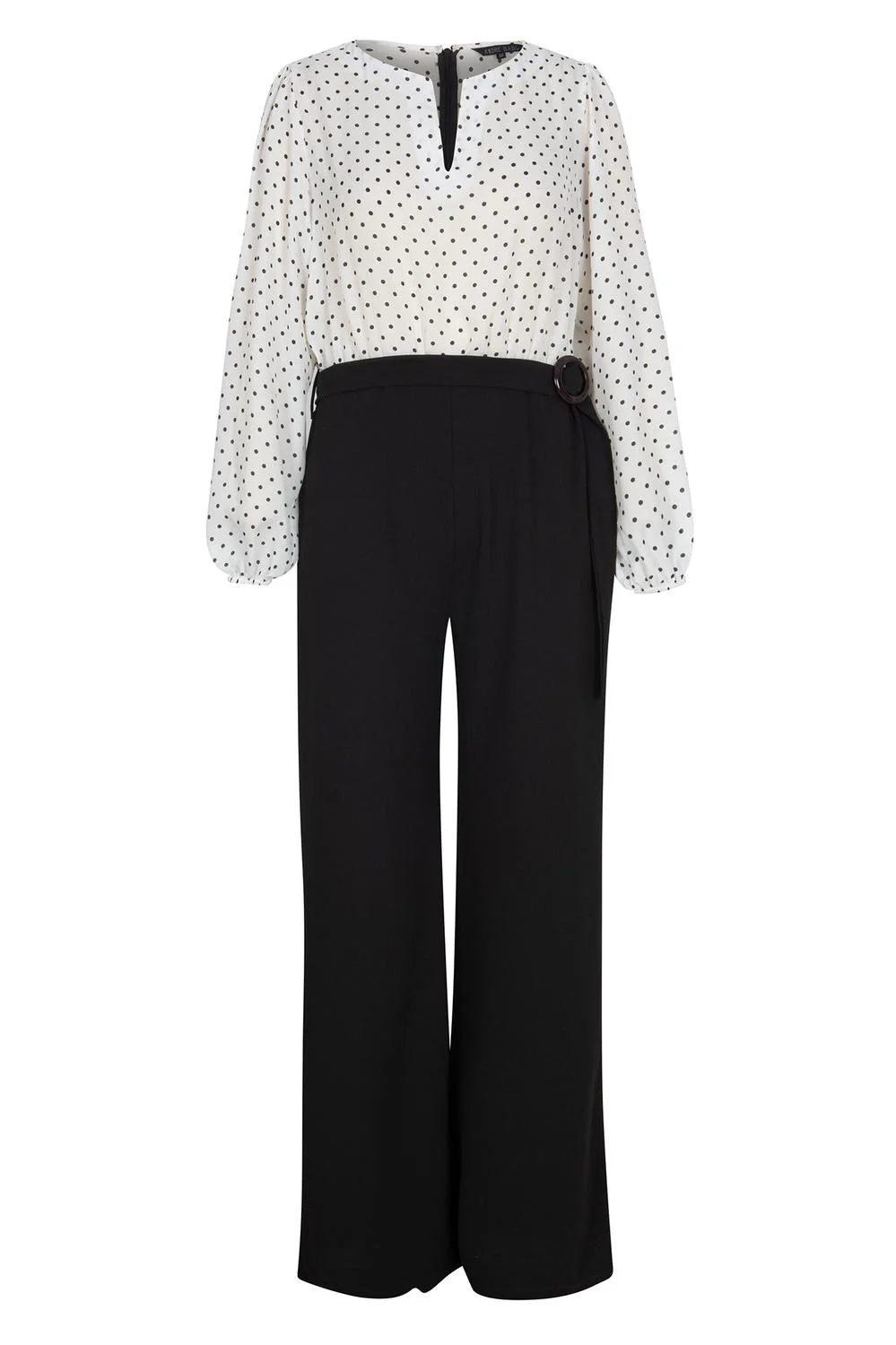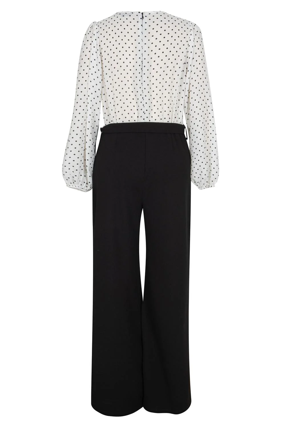 - Jumpsuit largo estampado con escote redondo, escote frontal, plisados decorativos, corte de piernas anchas, cinturón ajustable y mangas largas con elástico en puños.