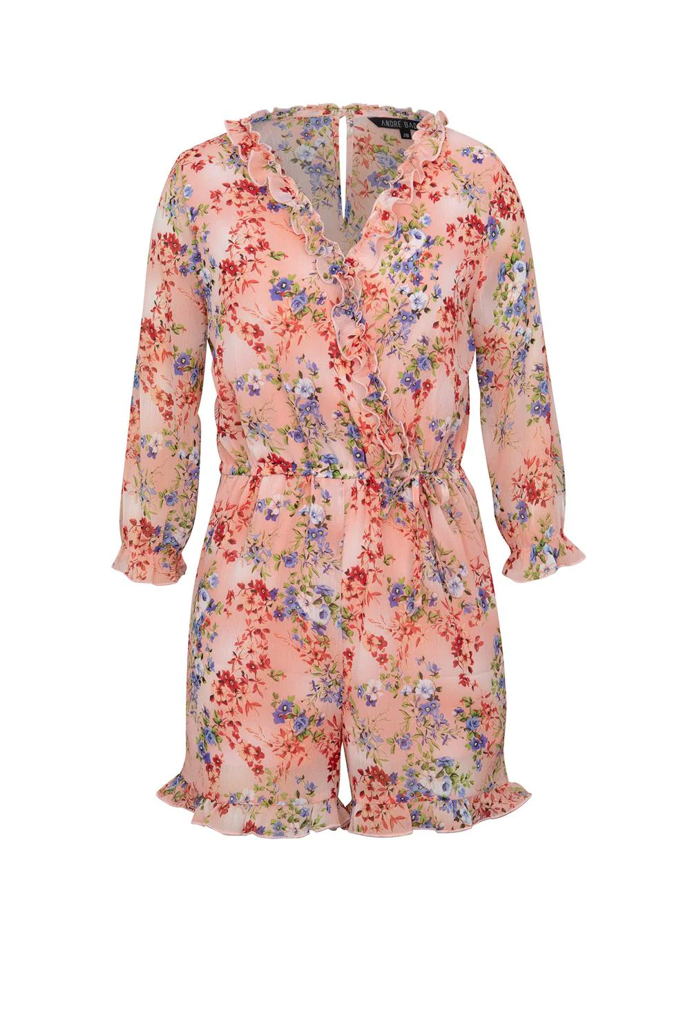 Jumpsuit estampado con escote cruzado, mangas 3/4, jareta en cintura y múltiples olanes decorativos. Código de producto 33-0120