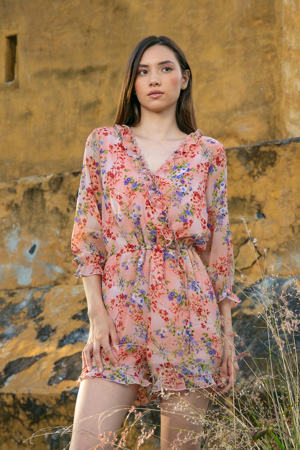 - Jumpsuit estampado con escote cruzado, mangas 3/4, jareta en cintura y múltiples olanes decorativos.