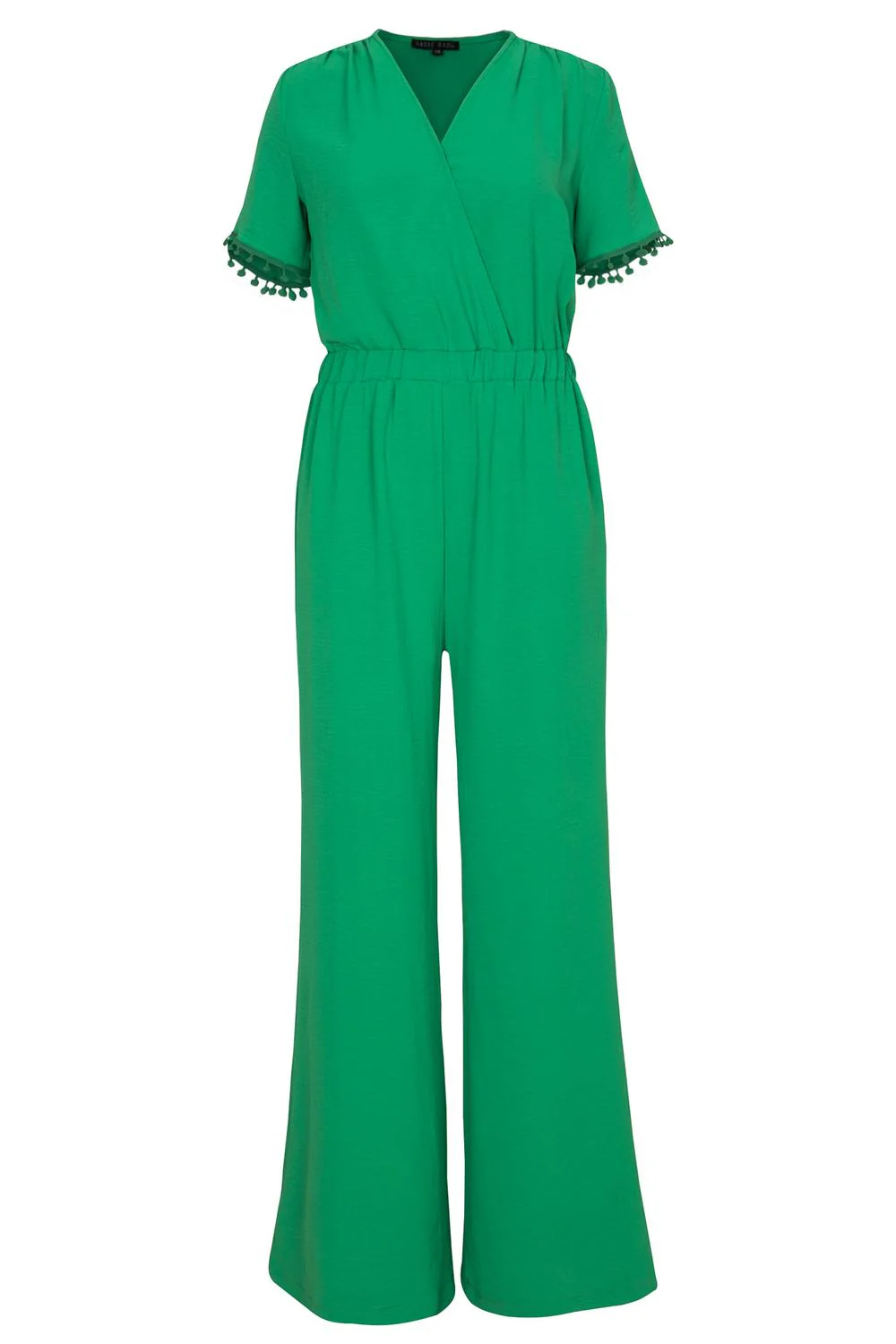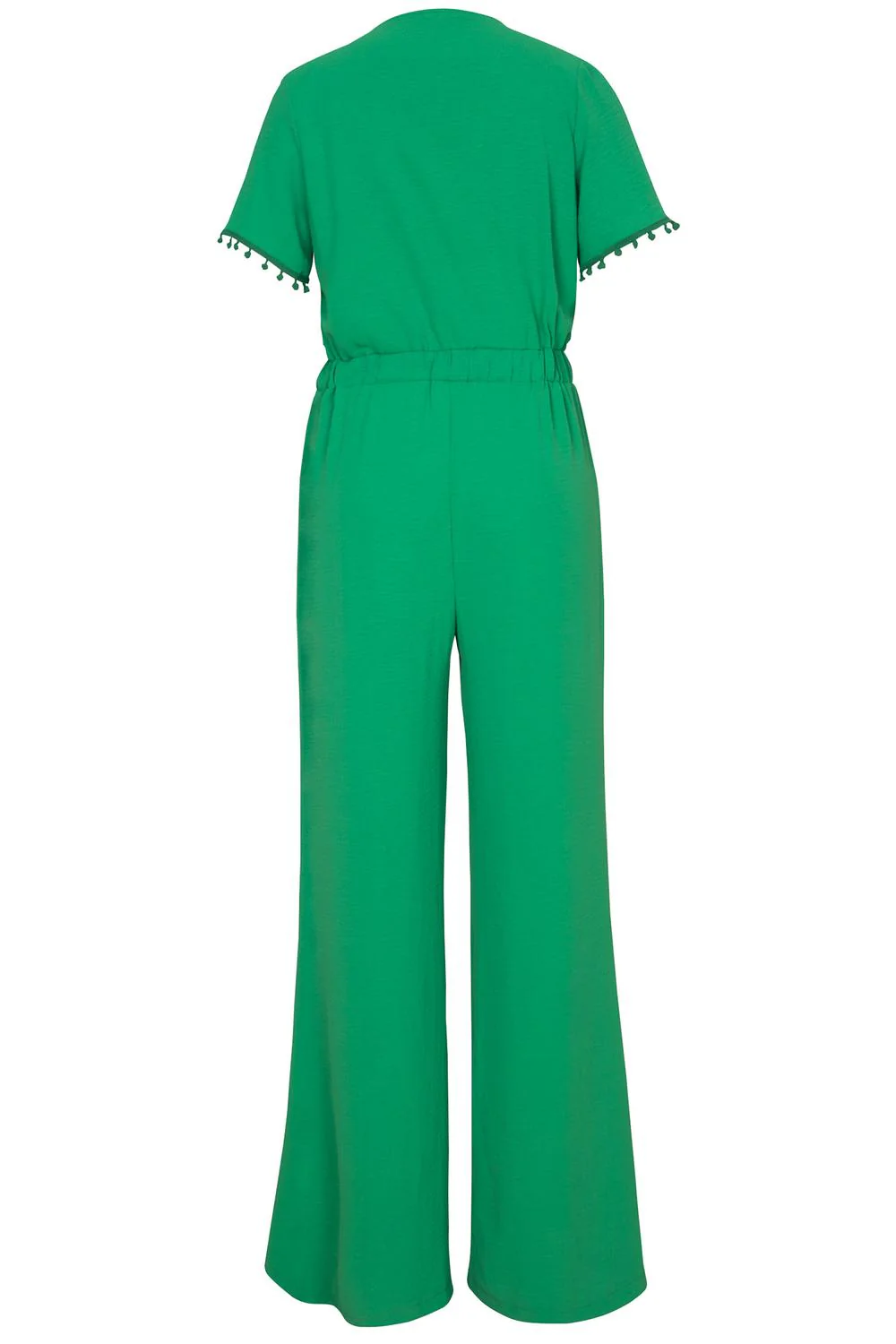 - Jumpsuits con escote cruzado elástico en cintura, mangas cortas y pantalón largo de corte ancho.