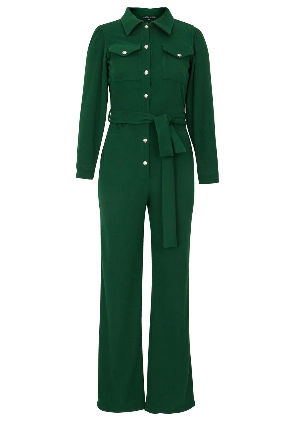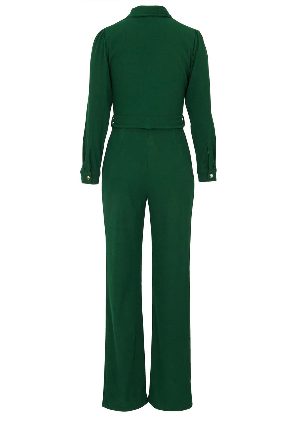 Jumpsuit efecto pana con cuello, botonadura frontal, lazo en cintura, mangas largas con pliegues y múltiples bolsillos.