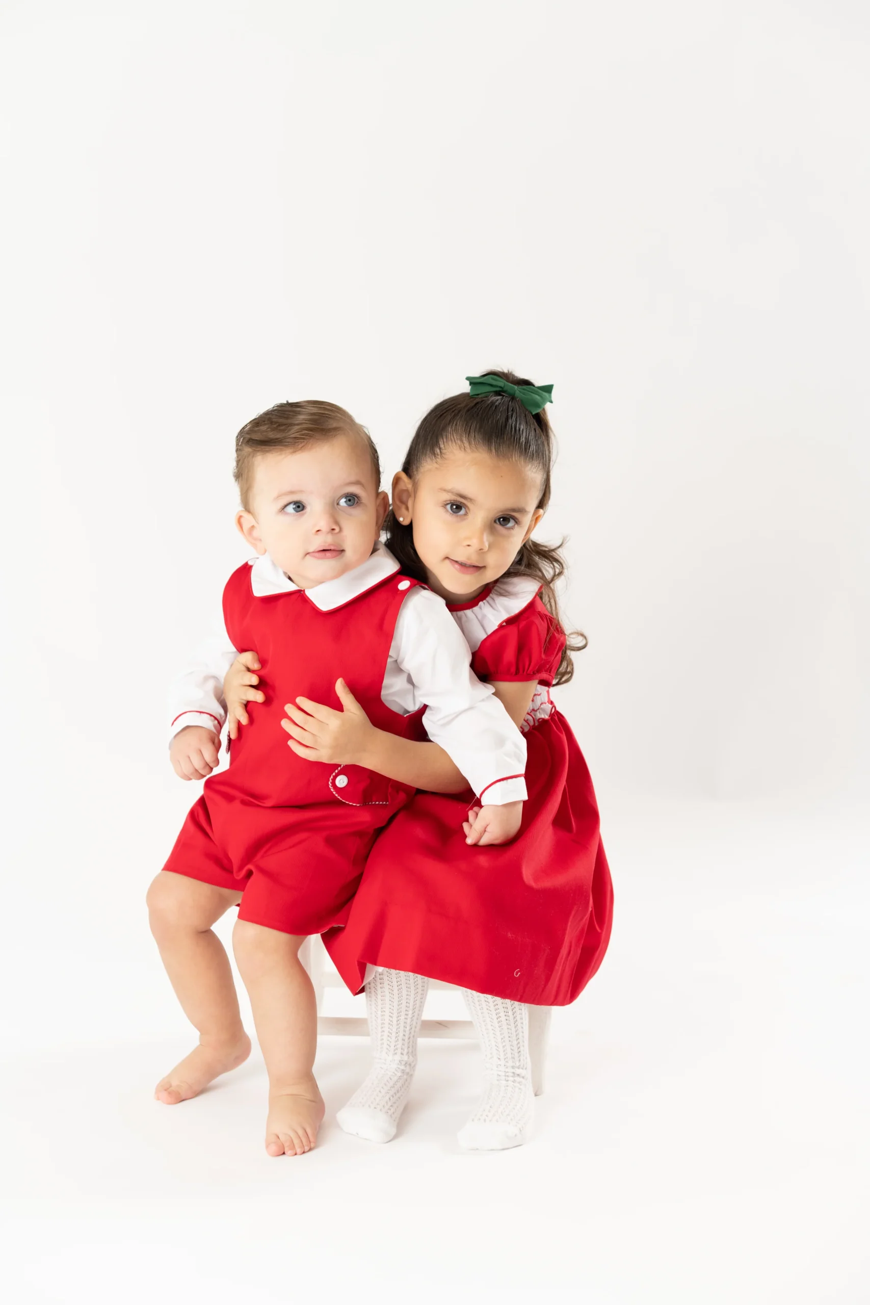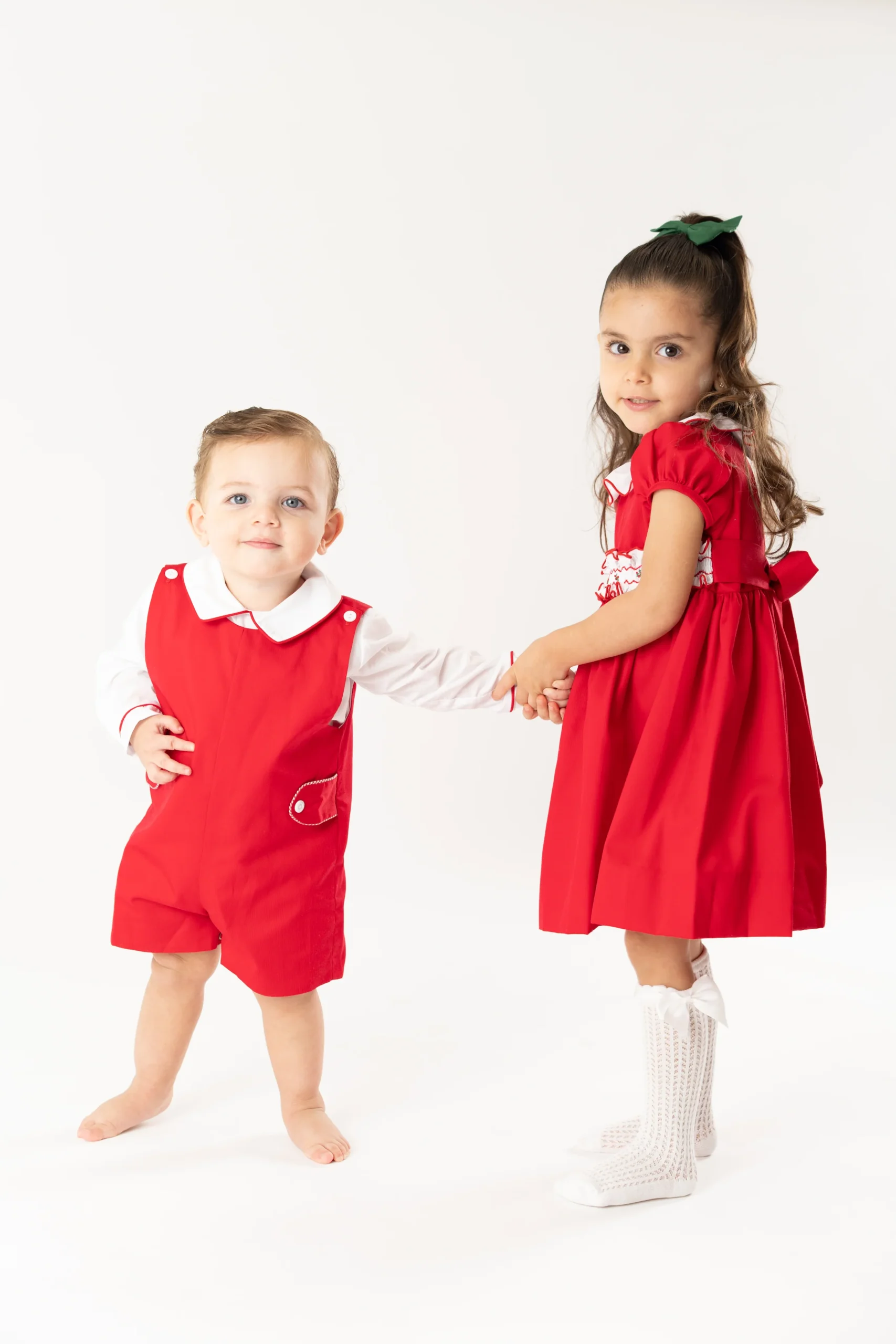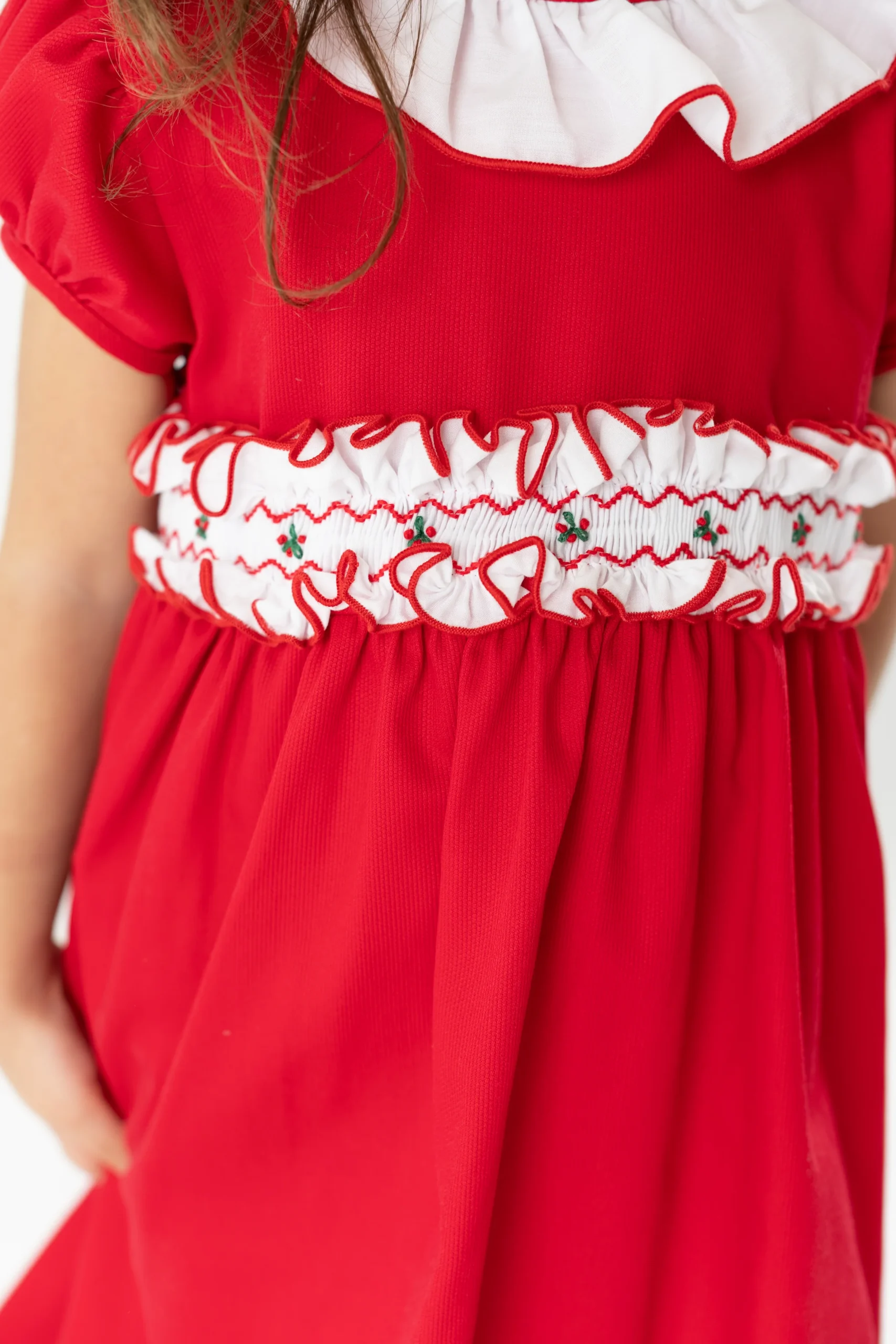 ¡Encantador vestido de color rojo ideal para esta epoca navideña! De cuello redondo con olan, manga corta con elastico, corte en la cintura con smock y olanes, detalle de lazos que se amarran por detras, cierre de zíper por detras para facilitar su puesta.