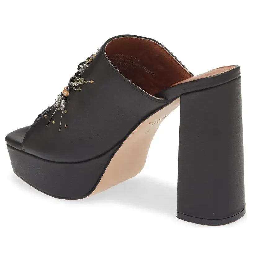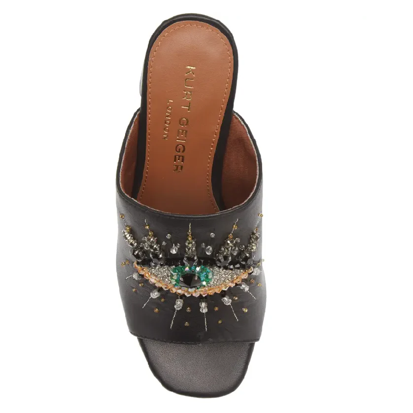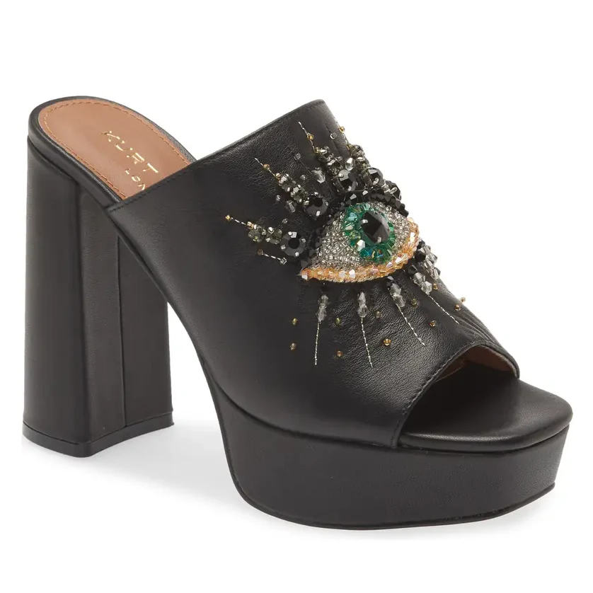 Un mal de ojo en un brillante trabajo de abalorios mira desde el empeine de cuero suave de esta sandalia de plataforma con punta cuadrada levantada sobre un imponente tacón de 12 cms; plataforma de 4’5 cms (talla 39)