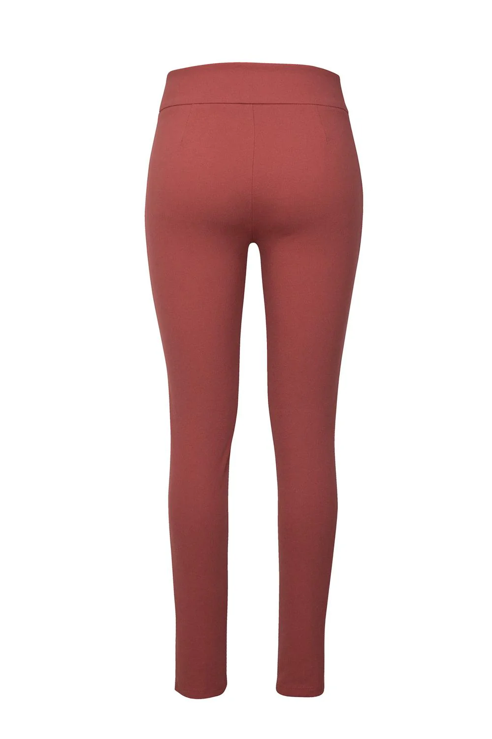 - Legging con pretina ancha, elástico en cintura, alforzas y botonadura decorativa.